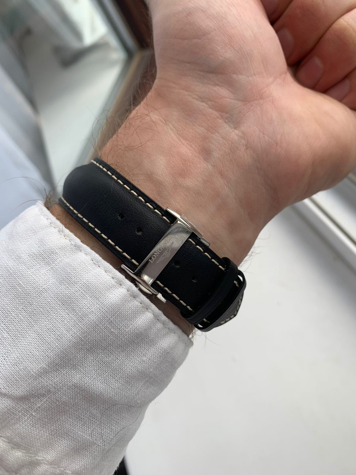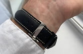 Ремешок из чёрной кожи с застёжкой бабочкойЗастёжка "бабочка"Такой вид застёжки дополняется предохранителями, помогающими избежать случайного раскрытия браслета. Обладают изящным исполнением. и механизмом открытия с кнопками обеспечивает комфортное и надёжное ношение.