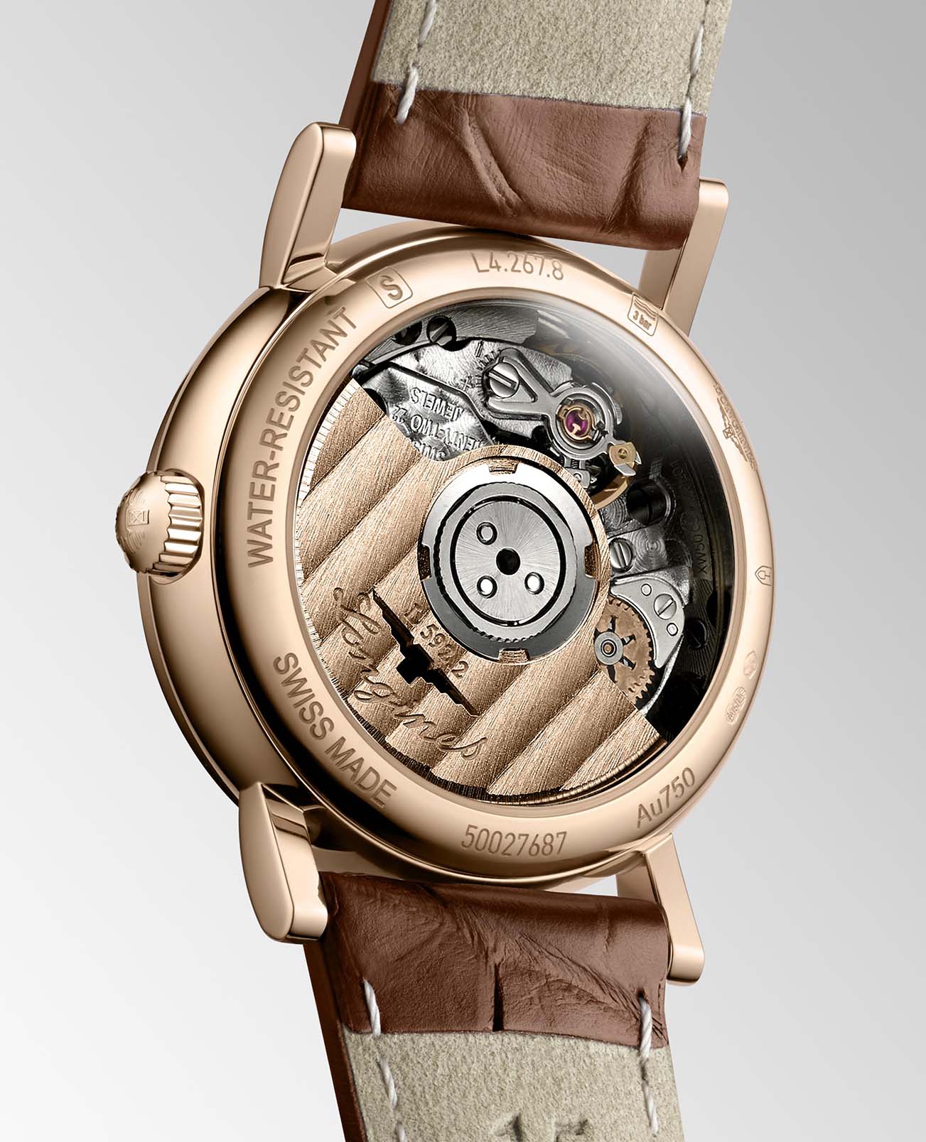 . Он защищает швейцарский автоматический механизм L592 с запасом хода на 40 часов. Прозрачная задняя крышка с сапфировым стеклом открывает доступ к движущимся деталям калибра. Стильно смотрится ремешок из натуральной кожи аллигатора.