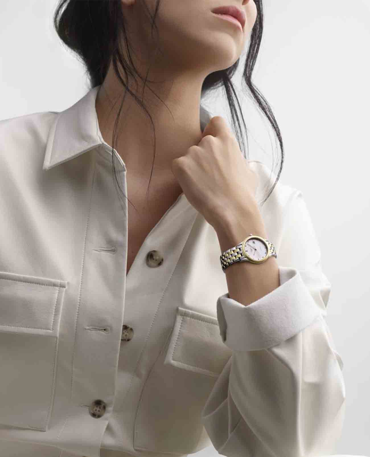 Корпус часов выполнен из высококачественной стали с частичным PVD-покрытиемPVDУльтратонкое покрытие наносится в технике вакуумного напыления, сочетает в себе нитрид титана особой прочности со слоем золота или оксида хрома. Несёт в себе декоративную или защитную функцию., что придаёт им дополнительную прочность и изысканность. Циферблат украшен 12 бриллиантами группы Top Wesselton VS-SI, общий вес которых составляет 0.081 карата, добавляя часам роскоши и особого шарма. Класс водозащиты 30 метров обеспечит защиту от случайных брызг или капель дождя. Стальной браслет с частичным PVD-покрытиемPVDУльтратонкое покрытие наносится в технике вакуумного напыления, сочетает в себе нитрид титана особой прочности со слоем золота или оксида хрома. Несёт в себе декоративную или защитную функцию. и застёжкой-бабочкой с кнопкамиЗастёжка "бабочка"Такой вид застёжки дополняется предохранителями, помогающими избежать случайного раскрытия браслета. Обладают изящным исполнением. подарит комфорт и уверенность при ношении, подчеркнув вашу индивидуальность и стиль.