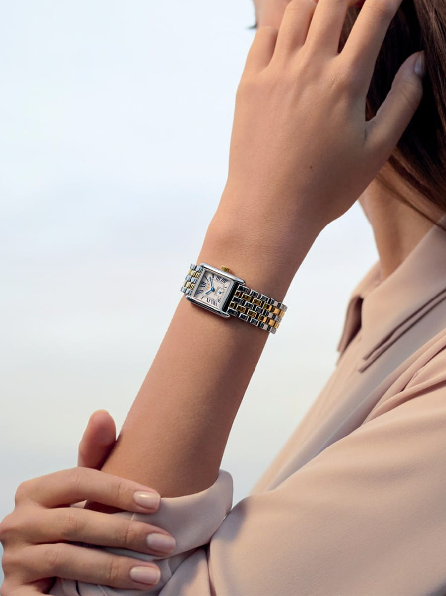 Изысканные женские часы LONGINES Mini DolceVita L5.200.5.70.7 — это воплощение спокойной роскоши и вечного стиля. Модель выполнена в прямоугольном корпусе размером 21.50 x 29.00 мм , изготовленном из нержавеющей стали. Циферблат серебристого цвета оформлен в технике flinqué , придающей ему особую глубину и переливы на свету. Часовая шкала отмечена нарисованными римскими цифрами , а для точности хода предусмотрены вороненые стальные стрелки и малая секундная стрелка в положении «6 часов». Все элементы циферблата подчеркивают элегантность и классический вкус модели. Защиту циферблата обеспечивает прочное сапфировое стеклоСапфировое стеклоПрочный и надёжный материал из кристалла сапфира синтетического происхождения, характеризующийся особой твёрдостью и устойчивостью к царапинам и повреждениям. с многослойным антибликовым покрытиемАнтибликовое покрытиеСлой оксида металла в 0,13-0,3 микрон, благодаря которому стекло часов не бликует и не отражает свет. Антибликовое покрытие уменьшает отражение света в 10 раз, обеспечивая отличную читаемость показателей циферблата. с обеих сторон, гарантирующее четкость показаний в любых условиях освещения. Механизм L178 (RENATA 379) — кварцевый калибр, который обеспечивает высокую точность и простоту использования. Также реализована функция EOLEOLПредставляет собой систему, уведомляющую владельца часов о необходимости замены элемента питания. За 2 недели до полного разряда батарейки секундная стрелка перестаёт ходить чётко и начинает перепрыгивать на 3-4 деления. (End of Life) — сигнал о замене батарейки. Корпус водонепроницаем до WR30 (3 АТМ) , что позволяет носить часы в повседневных условиях без опасений за сохранность механизма. Толщина составляет всего 6.75 мм , а общий вес — 65 г , что делает модель легкой и удобной для ежедневного ношения. Браслет выполнен из нержавеющей стали и желтого 18-каратного золото18-каратное золотоОбозначение по каратной системе пробирования, оно показывает, сколько драгоценного металла содержится в изделии. 18 карат - в составе 75% чистого золота, соответствует 750 пробе.