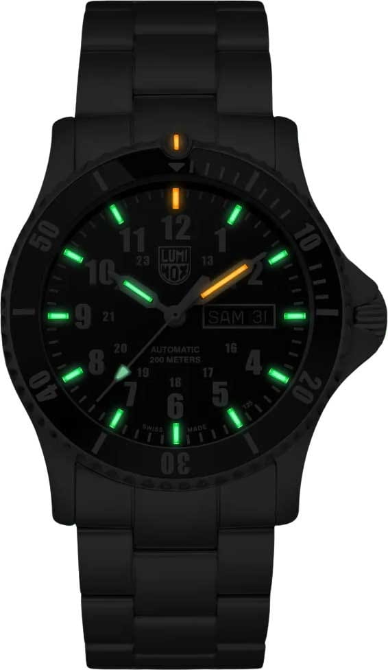 Часы Luminox XS.0921.M — истинное воплощение швейцарского качества и современного стиля. Эти мужские часы, оснащённые механизмом с автоподзаводом, предлагают безупречную точность и надёжность, благодаря использованию калибра Sellita SW 220-1 с 26 камнями. Корпус выполнен из высококачественной стали 316L, что придаёт дополнительную прочность и устойчивость к износу. Чёрный циферблат защищён сапфировым стекломСапфировое стеклоПрочный и надёжный материал из кристалла сапфира синтетического происхождения, характеризующийся особой твёрдостью и устойчивостью к царапинам и повреждениям. с антибликовым покрытиемАнтибликовое покрытиеСлой оксида металла в 0,13-0,3 микрон, благодаря которому стекло часов не бликует и не отражает свет. Антибликовое покрытие уменьшает отражение света в 10 раз, обеспечивая отличную читаемость показателей циферблата., что позволяет с лёгкостью считывать показания даже при ярком освещении. Часы обладают функцией отображения даты и дня недели, расположенной в удобном окошке в позиции 3 часа. Вращающийся в одном направлении керамический безельБезельВнешний ободок, закрепляющий стекло. В спортивных часах так называется поворотное кольцо с делениями на циферблате, выполняет роль таймера – замеряет отрезки времени на шкале. Неподвижный безель – элемент декора. Однонаправленно вращающийся безель на дайверских часах позволяет фиксировать моменты погружения и выныривания на поверхность. обеспечивает дополнительную функциональность и стильный вид. Благодаря технологии LLTLLTLLT — это автономный механизм подсветки, основанный на использовании микроскопических газонаполненных элементов. Специальные герметичные капсулы из боросиликатного стекла, интегрированные в циферблат, генерируют свечение без необходимости подключения к внешним источникам энергии. Для их работы не требуется ни дополнительный свет, ни механическое воздействие (например, нажатие кнопки). Свечение возникает благодаря химическому процессу: реакция между тритием, заключенным в капсулах, и люминофорным покрытием создает стабильное автономное освещение. Технология обеспечивает энергетическую независимость и долговечность подсветки.-подсветки, эти часы гарантируют превосходную видимость в темноте на протяжении 25 лет. Завинчивающаяся заводная головка с защитой и прозрачная задняя крышка подчёркивают внимание к деталям и практичность дизайна. Стальной браслет, изготовленный из того же материала, что и корпус, оснащён раскладной застёжкойРаскладная застёжкаТакой тип застёжки используется только на браслетах из металла. Она никогда не раскрывается полностью, происходит разделение на 2 и более частей. Раскладывающая застёжка снизит вероятность потери часов к минимуму. с системой блокировки, обеспечивая надёжную фиксацию на запястье. Водозащита уровня 200WR позволяет использовать часы даже в условиях повышенной влажности. Габаритные размеры составляют 42 мм в диаметре, 13 мм в толщину, с шириной браслета 24 мм и весом 185 г, что делает их идеальным выбором для тех, кто ценит стиль и функциональность в одном аксессуаре.