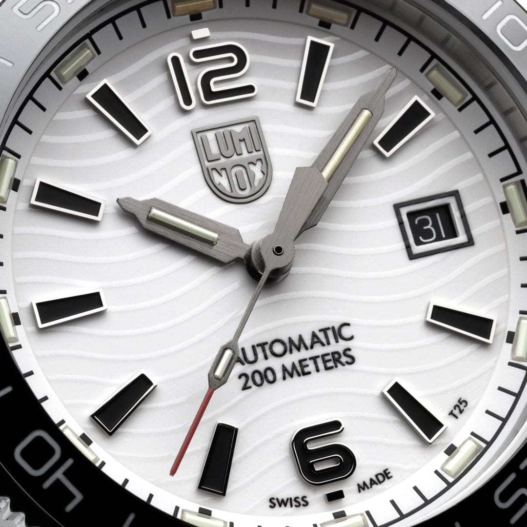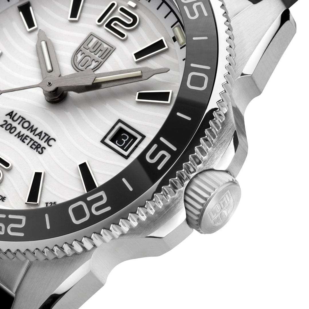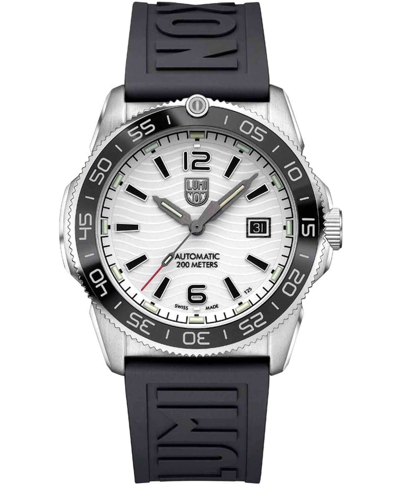 Мужские швейцарские наручные часы Luminox Pacific Diver Automatic XS.3101.H олицетворяют собой идеальное сочетание элегантного дизайна и передовых технологий. Оснащены они высокоточным кварцевым механизмом, который обеспечивает исключительную точность и надежность в работе. Циферблат этих часов защищен прочным сапфировым стекломСапфировое стеклоПрочный и надёжный материал из кристалла сапфира синтетического происхождения, характеризующийся особой твёрдостью и устойчивостью к царапинам и повреждениям. с антибликовым покрытиемАнтибликовое покрытиеСлой оксида металла в 0,13-0,3 микрон, благодаря которому стекло часов не бликует и не отражает свет. Антибликовое покрытие уменьшает отражение света в 10 раз, обеспечивая отличную читаемость показателей циферблата., устойчивым к царапинам и обладающим высокой степенью прозрачности, что гарантирует отличное визуальное восприятие информации независимо от условий освещения. Корпус часов выполнен из высококачественной нержавеющей стали 316L, что обеспечивает их долговечность и стойкость к механическим повреждениям. Стрелки с LLTLLTLLT — это автономный механизм подсветки, основанный на использовании микроскопических газонаполненных элементов. Специальные герметичные капсулы из боросиликатного стекла, интегрированные в циферблат, генерируют свечение без необходимости подключения к внешним источникам энергии. Для их работы не требуется ни дополнительный свет, ни механическое воздействие (например, нажатие кнопки). Свечение возникает благодаря химическому процессу: реакция между тритием, заключенным в капсулах, и люминофорным покрытием создает стабильное автономное освещение. Технология обеспечивает энергетическую независимость и долговечность подсветки.-подсветкой, обеспечивают отличную видимость даже в условиях недостаточной освещенности, что делает их удобными для использования в любых условиях. Окошко даты, расположенное на отметке 3 часа, позволяет быстро и удобно узнавать текущее число. Класс водозащиты 200 метров, позволит плавать, нырять и заниматься другими водными видами спорта. Каучуковый ремешок на стандартной застежке обеспечивает комфорт при ношении и универсальность использования. Эти часы, оснащенные автоматическим механизмом Sellita SW 220-1, сочетают в себе безельБезельВнешний ободок, закрепляющий стекло. В спортивных часах так называется поворотное кольцо с делениями на циферблате, выполняет роль таймера – замеряет отрезки времени на шкале. Неподвижный безель – элемент декора. Однонаправленно вращающийся безель на дайверских часах позволяет фиксировать моменты погружения и выныривания на поверхность. из нержавеющей стали с черным ремешком и черной керамической кольцевой вставкой вращается в одном направлении, что подчеркивает их стильный и универсальный характер.