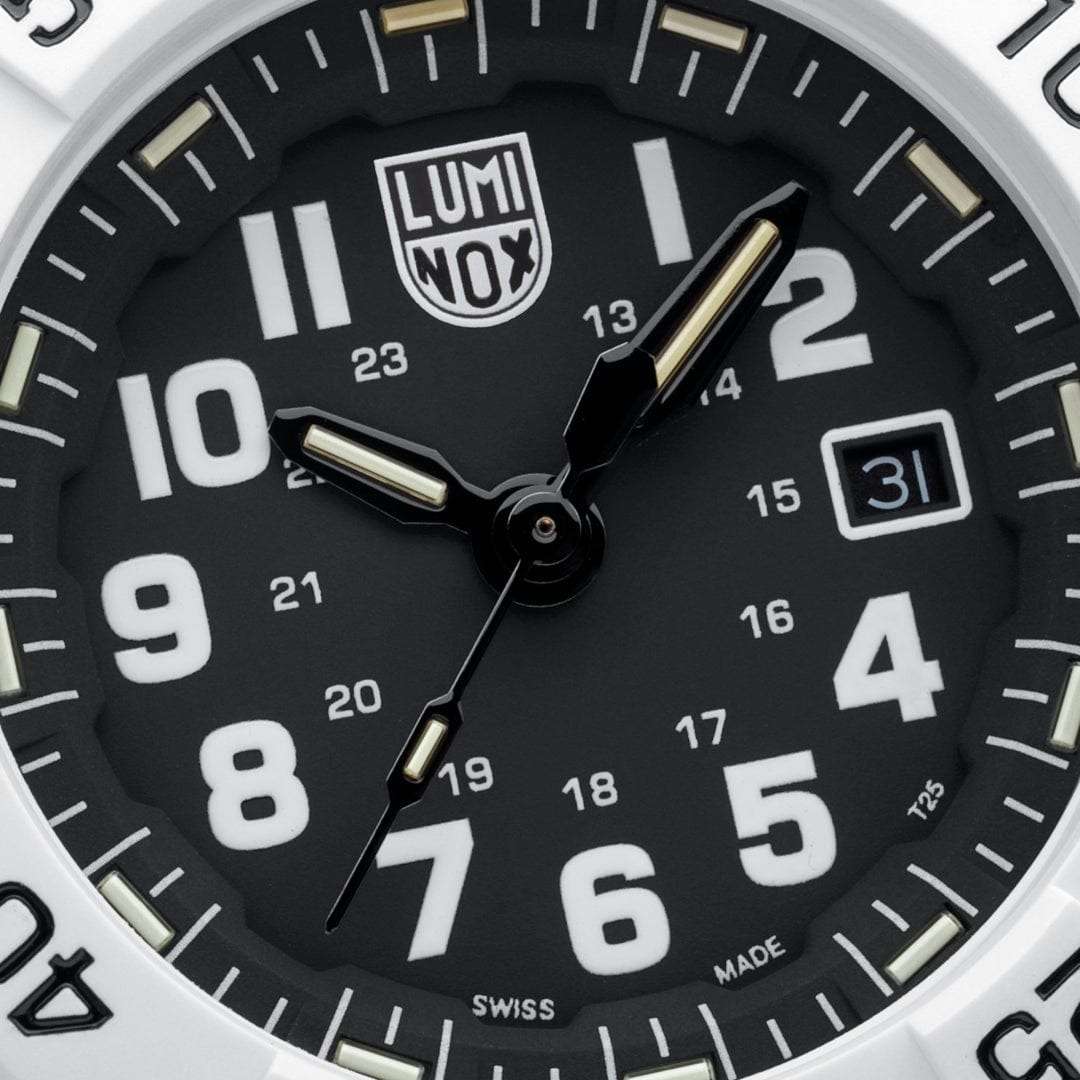 Часы Luminox XS.3507.WB — это надежные и стильные швейцарские часы с кварцевым механизмом, оснащенные калибром Ronda 515. Корпус выполнен из пластика, усиленного прессованным карбоном CARBONOX, что обеспечивает прочность и долговечность. Черный циферблат защищен минеральным стекломМинеральное стеклоМинеральное стекло представляет собой искусственно выращенный минерал кварца. Такое стекло отличается особой устойчивостью к повреждениям и царапинам. Уступает по некоторым качествам сапфировому стеклу. повышенной прочности, что делает его устойчивым к царапинам и ударам. Резиновый ремешок с классической застежкой обеспечивает комфортное ношение и надежность фиксации на запястье. Эти часы обладают впечатляющим уровнем водозащиты до 200 метров, что делает их подходящими для водных видов спорта и активного отдыха. Светящаяся метка на безелеБезельВнешний ободок, закрепляющий стекло. В спортивных часах так называется поворотное кольцо с делениями на циферблате, выполняет роль таймера – замеряет отрезки времени на шкале. Неподвижный безель – элемент декора. Однонаправленно вращающийся безель на дайверских часах позволяет фиксировать моменты погружения и выныривания на поверхность., который вращается в одном направлении, добавляет функциональности и удобства, особенно в условиях низкой освещенности. Технология LLTLLTLLT — это автономный механизм подсветки, основанный на использовании микроскопических газонаполненных элементов. Специальные герметичные капсулы из боросиликатного стекла, интегрированные в циферблат, генерируют свечение без необходимости подключения к внешним источникам энергии. Для их работы не требуется ни дополнительный свет, ни механическое воздействие (например, нажатие кнопки). Свечение возникает благодаря химическому процессу: реакция между тритием, заключенным в капсулах, и люминофорным покрытием создает стабильное автономное освещение. Технология обеспечивает энергетическую независимость и долговечность подсветки.-подсветки обеспечивает отличную видимость в темноте на протяжении 25 лет, позволяя контролировать время даже при полном отсутствии света. Часы поддерживают отображение времени в 12- и 24-часовом формате, а наличие календаря с указанием числа добавляет практичности. Заводная головка снабжена защитой и двойной уплотнительной прокладкой для обеспечения герметичности, а задняя крышка крепится на винтах для дополнительной надежности.