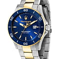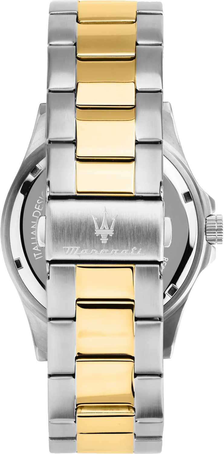 Мужские часы Maserati R8873600010 — это стильное сочетание элегантности и современного дизайна. Корпус из нержавеющей стали с диаметром 43 мм идеально сбалансирован и элегантен. Минеральное стеклоМинеральное стеклоМинеральное стекло представляет собой искусственно выращенный минерал кварца. Такое стекло отличается особой устойчивостью к повреждениям и царапинам. Уступает по некоторым качествам сапфировому стеклу. защищает циферблат от царапин. Стальной браслет с PVD-покрытиемPVDУльтратонкое покрытие наносится в технике вакуумного напыления, сочетает в себе нитрид титана особой прочности со слоем золота или оксида хрома. Несёт в себе декоративную или защитную функцию. на застёжке-бабочке с кнопкамиЗастёжка "бабочка"Такой вид застёжки дополняется предохранителями, помогающими избежать случайного раскрытия браслета. Обладают изящным исполнением. идеально дополняют дизайн часов, обеспечивая комфортное ношение. Стрелки и метки с люминесцентным покрытиемЛюминесцентное покрытиеПозволяет считывать показания времени в темноте. Производители наносят на стрелки, часовые индексы, безель или поверхность циферблата светонакопительный состав, дающий холодное свечение.. БезельБезельВнешний ободок, закрепляющий стекло. В спортивных часах так называется поворотное кольцо с делениями на циферблате, выполняет роль таймера – замеряет отрезки времени на шкале. Неподвижный безель – элемент декора. Однонаправленно вращающийся безель на дайверских часах позволяет фиксировать моменты погружения и выныривания на поверхность. с керамической вставкой. Часы обладают впечатляющей водонепроницаемостью до 10 бар (100 метров), что делает их идеальными для повседневной носки. Метки в виде штрихов. Окошко даты с увеличительным стеклом находится в положении 3 часа.