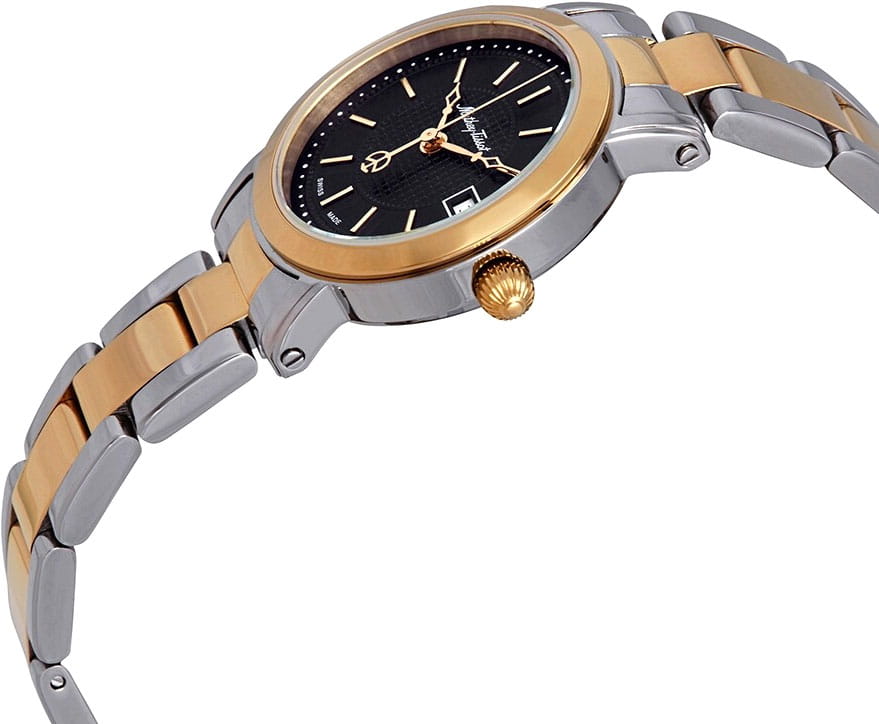 Женские кварцевые часы Mathey-Tissot City Metal D31186MBN — это стильное сочетание элегантности и современного дизайна. Изящный корпус выполнен из стали 316L с безелемБезельВнешний ободок, закрепляющий стекло. В спортивных часах так называется поворотное кольцо с делениями на циферблате, выполняет роль таймера – замеряет отрезки времени на шкале. Неподвижный безель – элемент декора. Однонаправленно вращающийся безель на дайверских часах позволяет фиксировать моменты погружения и выныривания на поверхность. с PVD-покрытиемPVDУльтратонкое покрытие наносится в технике вакуумного напыления, сочетает в себе нитрид титана особой прочности со слоем золота или оксида хрома. Несёт в себе декоративную или защитную функцию., что придаст образу женственности и романтизма. Изысканный циферблат с метками в виде штрихов придает модели особый блеск и защищен минеральным стекломМинеральное стеклоМинеральное стекло представляет собой искусственно выращенный минерал кварца. Такое стекло отличается особой устойчивостью к повреждениям и царапинам. Уступает по некоторым качествам сапфировому стеклу., обеспечивающим устойчивость к царапинам. Часы оснащены надежным кварцевым механизмом. Окошко даты находится в положении 3 часа. Стальной браслет с частичным PVD-покрытиемPVDУльтратонкое покрытие наносится в технике вакуумного напыления, сочетает в себе нитрид титана особой прочности со слоем золота или оксида хрома. Несёт в себе декоративную или защитную функцию. на раскладной застёжкеРаскладная застёжкаТакой тип застёжки используется только на браслетах из металла. Она никогда не раскрывается полностью, происходит разделение на 2 и более частей. Раскладывающая застёжка снизит вероятность потери часов к минимуму., гарантирующего комфортное и безопасное ношение. Класс водозащиты: 50 метров позволит защитить корпус от случайных брызг или капель дождя. Mathey-Tissot — отличный выбор для тех, кто ценит утонченность и качество.