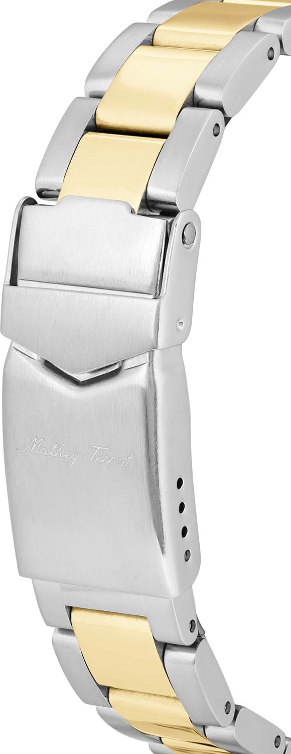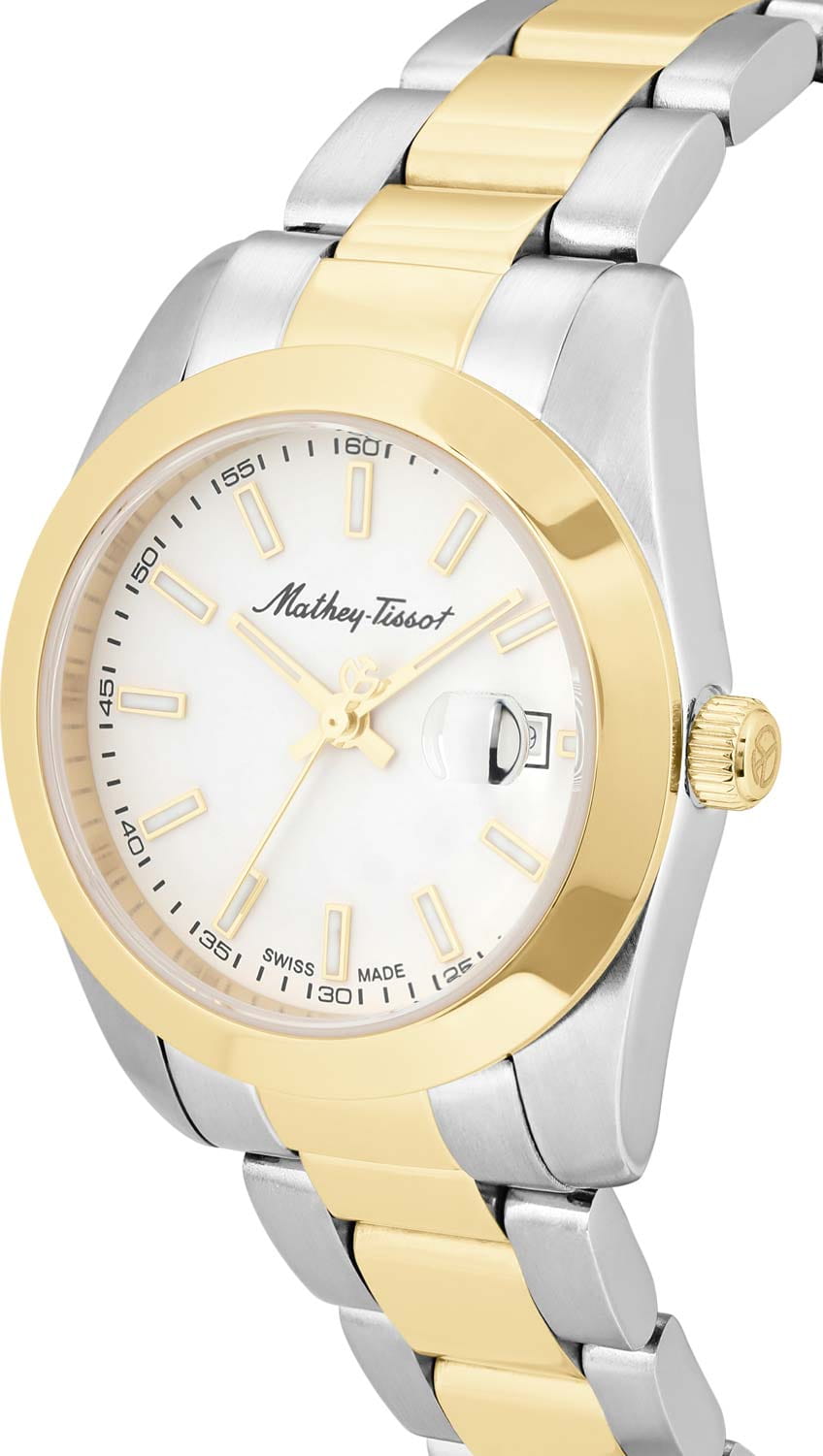 Женские кварцевые часы Mathey-Tissot Mathy D450BI — это стильное сочетание элегантности и современного дизайна. Изящный корпус выполнен из нержавеющей стали, диаметром 30 мм, что придаст образу женственности и романтизма. Изысканный циферблат с метками в виде штрихов придает модели особый блеск. Циферблат защищен минеральным стекломМинеральное стеклоМинеральное стекло представляет собой искусственно выращенный минерал кварца. Такое стекло отличается особой устойчивостью к повреждениям и царапинам. Уступает по некоторым качествам сапфировому стеклу., обеспечивающий устойчивость к царапинам. Стрелки и метки с люминесцентным покрытиемЛюминесцентное покрытиеПозволяет считывать показания времени в темноте. Производители наносят на стрелки, часовые индексы, безель или поверхность циферблата светонакопительный состав, дающий холодное свечение.. БезельБезельВнешний ободок, закрепляющий стекло. В спортивных часах так называется поворотное кольцо с делениями на циферблате, выполняет роль таймера – замеряет отрезки времени на шкале. Неподвижный безель – элемент декора. Однонаправленно вращающийся безель на дайверских часах позволяет фиксировать моменты погружения и выныривания на поверхность. с PVD-покрытиемPVDУльтратонкое покрытие наносится в технике вакуумного напыления, сочетает в себе нитрид титана особой прочности со слоем золота или оксида хрома. Несёт в себе декоративную или защитную функцию. золотистого цвета. Окошко даты находится в положении 3 часа. Часы оснащены надежным кварцевым механизмом. Стальной браслет с частичным PVD-покрытиемPVDУльтратонкое покрытие наносится в технике вакуумного напыления, сочетает в себе нитрид титана особой прочности со слоем золота или оксида хрома. Несёт в себе декоративную или защитную функцию. на раскладной застёжке с фиксаторомРаскладная застёжкаТакой тип застёжки используется только на браслетах из металла. Она никогда не раскрывается полностью, происходит разделение на 2 и более частей. Раскладывающая застёжка снизит вероятность потери часов к минимуму., гарантирует комфортное и безопасное ношение. Класс водозащиты: 50 метров позволит защитить корпус от случайных брызг или капель дождя. Mathey-Tissot  — отличный выбор для тех, кто ценит утонченность и качество.