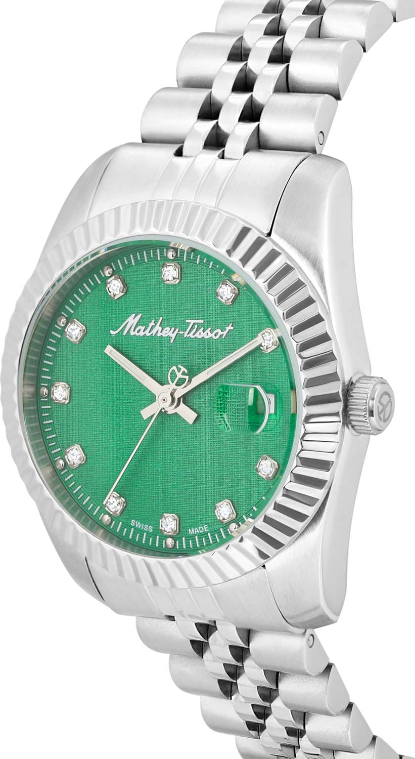 Женские кварцевые часы Mathey-Tissot Mathy D810AV — это стильное сочетание элегантности и современного дизайна. Изящный корпус выполнен из нержавеющей стали, диаметром 32 мм, что придаст образу женственности и романтизма. Изысканный циферблат с метками в виде точек украшены цирконами, что придает модели особый блеск. Циферблат защищен минеральным стекломМинеральное стеклоМинеральное стекло представляет собой искусственно выращенный минерал кварца. Такое стекло отличается особой устойчивостью к повреждениям и царапинам. Уступает по некоторым качествам сапфировому стеклу., обеспечивающий устойчивость к царапинам. Стрелки с люминесцентным покрытиемЛюминесцентное покрытиеПозволяет считывать показания времени в темноте. Производители наносят на стрелки, часовые индексы, безель или поверхность циферблата светонакопительный состав, дающий холодное свечение.. Окошко даты находится в положении 3 часа. Часы оснащены надежным кварцевым механизмом. Стальной браслет на раскладной застёжкеРаскладная застёжкаТакой тип застёжки используется только на браслетах из металла. Она никогда не раскрывается полностью, происходит разделение на 2 и более частей. Раскладывающая застёжка снизит вероятность потери часов к минимуму., гарантирует комфортное и безопасное ношение. Класс водозащиты: 50 метров позволит защитить корпус от случайных брызг или капель дождя. Mathey-Tissot — отличный выбор для тех, кто ценит утонченность и качество.