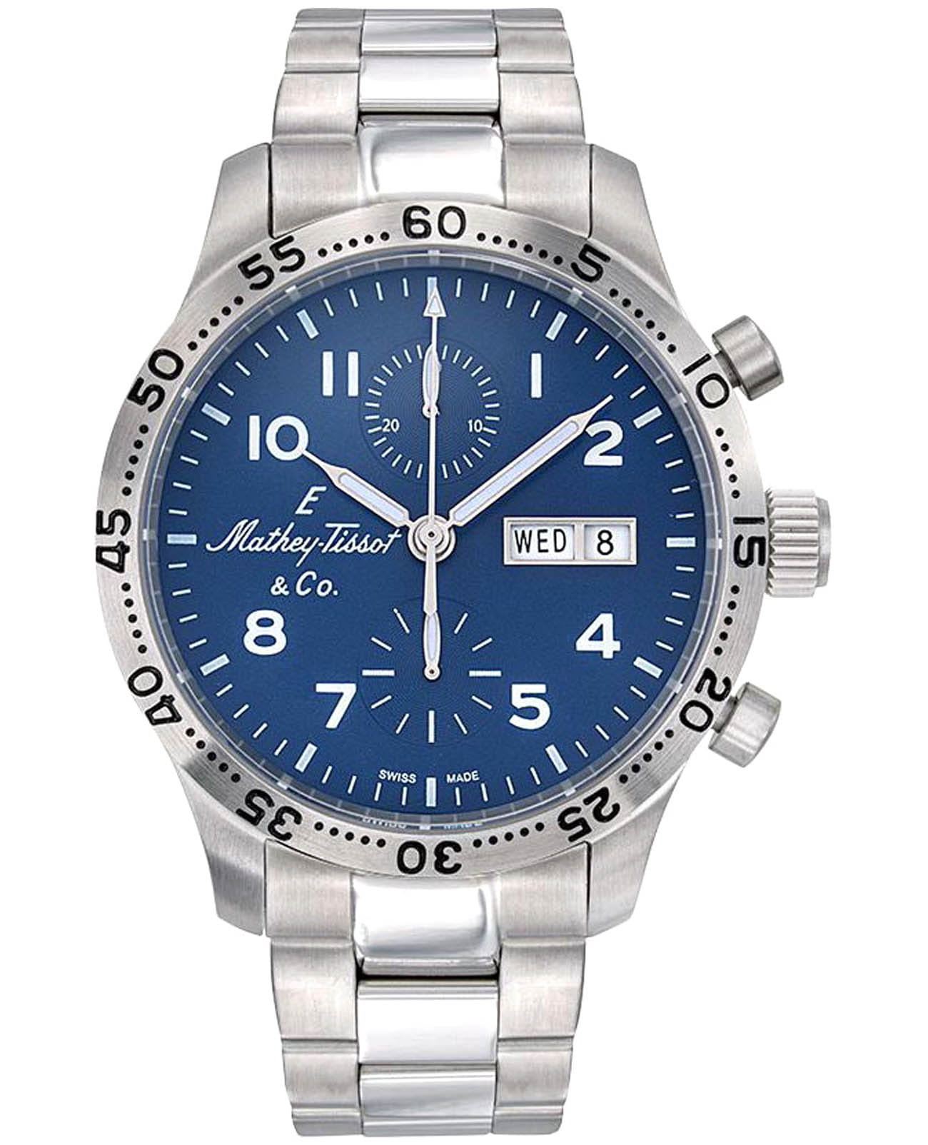 Мужские механические часы-хронографХронографФункция позволяет измерять отрезки времени с особой точностью: часы, минуты, секунды. Верным признаком хронографа является наличие на циферблате 3 дополнительных окошек-счётчиков. с секундомеромСекундомерСекундоме́р — прибор, способный измерять интервалы времени с точностью до долей секунды. Mathey-Tissot Type 21 H1821CHATBUG — это стильное сочетание элегантности и современного дизайна. Изящный корпус выполнен из нержавеющей стали, диаметром 42 мм, что придаст образу элегантности и надежности. Изысканный циферблат с метками в виде арабских цифр придает модели особый блеск. Циферблат защищен сапфировым стекломСапфировое стеклоПрочный и надёжный материал из кристалла сапфира синтетического происхождения, характеризующийся особой твёрдостью и устойчивостью к царапинам и повреждениям., обеспечивает устойчивость к царапинам. Стрелки с люминесцентным покрытиемЛюминесцентное покрытиеПозволяет считывать показания времени в темноте. Производители наносят на стрелки, часовые индексы, безель или поверхность циферблата светонакопительный состав, дающий холодное свечение.. Окошко даты находится в положении 3 часа. Стальной браслет на раскладной застёжке с фиксаторомРаскладная застёжкаТакой тип застёжки используется только на браслетах из металла. Она никогда не раскрывается полностью, происходит разделение на 2 и более частей. Раскладывающая застёжка снизит вероятность потери часов к минимуму., гарантирует комфортное и безопасное ношение. Рифленая заводная головка. Класс водозащиты: 50 метров позволит защитить корпус от случайных брызг или капель дождя. Mathey-Tissot  — отличный выбор для тех, кто ценит утонченность и качество.