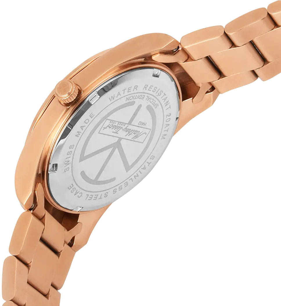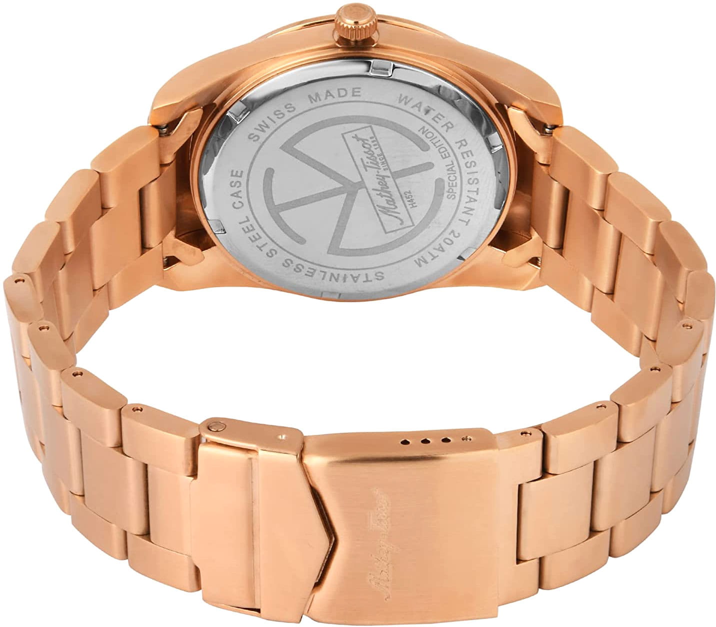Мужские кварцевые часы Mathey-Tissot Mathy H452PRBU — это стильное сочетание элегантности и современного дизайна. Изящный корпус выполнен из нержавеющей стали с PVD-покрытиемPVDУльтратонкое покрытие наносится в технике вакуумного напыления, сочетает в себе нитрид титана особой прочности со слоем золота или оксида хрома. Несёт в себе декоративную или защитную функцию. цвета розового золота, диаметром 42 мм, что придаст образу элегантности и надежности. Изысканный циферблат с метками в виде штрихов придает модели особый блеск. Циферблат защищен минеральным стекломМинеральное стеклоМинеральное стекло представляет собой искусственно выращенный минерал кварца. Такое стекло отличается особой устойчивостью к повреждениям и царапинам. Уступает по некоторым качествам сапфировому стеклу., обеспечивает устойчивость к царапинам. Стрелки и метки с люминесцентным покрытиемЛюминесцентное покрытиеПозволяет считывать показания времени в темноте. Производители наносят на стрелки, часовые индексы, безель или поверхность циферблата светонакопительный состав, дающий холодное свечение.. Окошко даты находится в положении 3 часа. Часы оснащены надежным кварцевым механизмом. Стальной браслет с PVD-покрытиемPVDУльтратонкое покрытие наносится в технике вакуумного напыления, сочетает в себе нитрид титана особой прочности со слоем золота или оксида хрома. Несёт в себе декоративную или защитную функцию. на раскладной застёжке с фиксаторомРаскладная застёжкаТакой тип застёжки используется только на браслетах из металла. Она никогда не раскрывается полностью, происходит разделение на 2 и более частей. Раскладывающая застёжка снизит вероятность потери часов к минимуму., гарантирует комфортное и безопасное ношение. Рифленая заводная головка. Класс водозащиты: 200 метров, позволит плавать нырять и заниматься другими водными видами спорта. Mathey-Tissot  — отличный выбор для тех, кто ценит утонченность и качество.