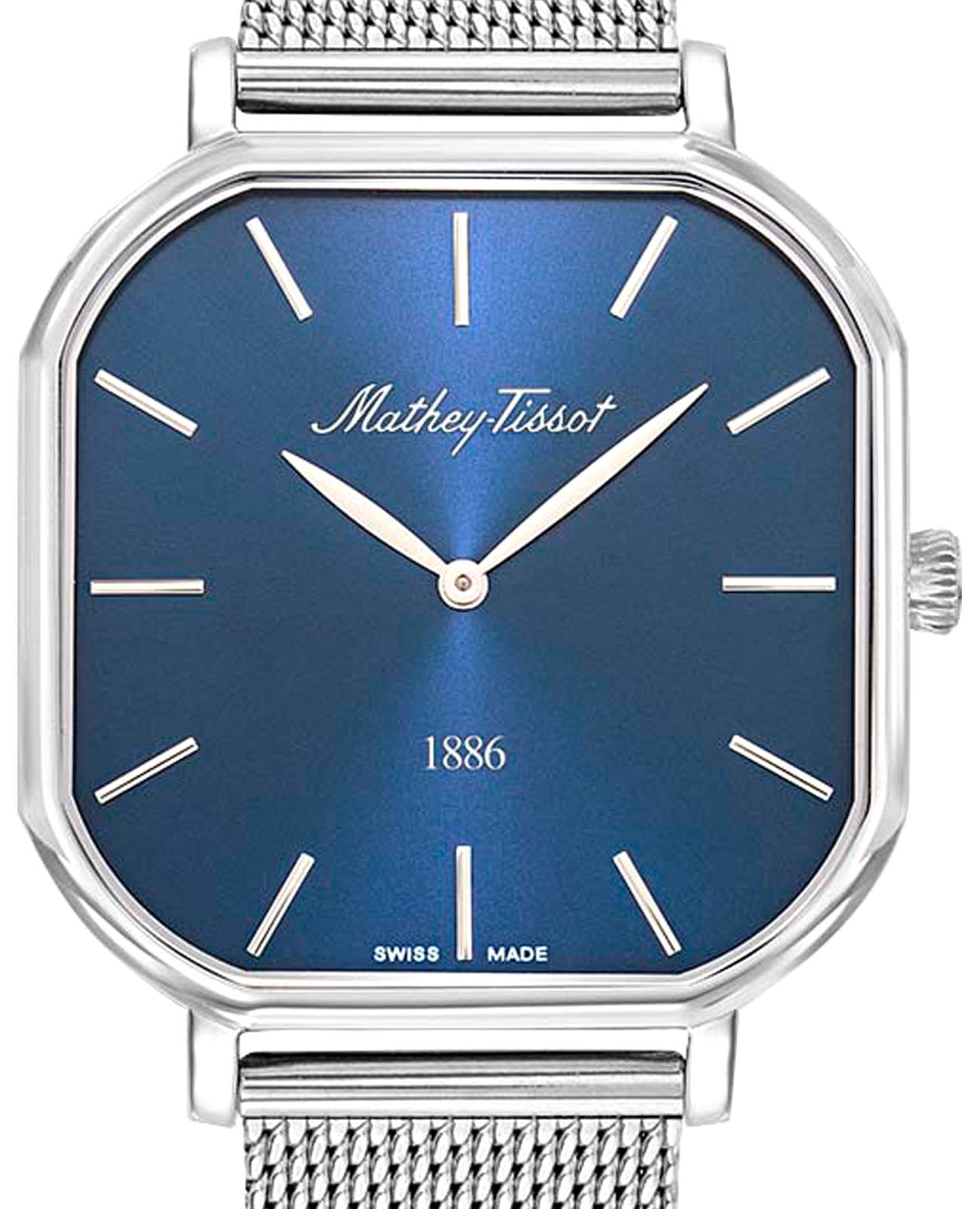Мужские кварцевые часы Mathey-Tissot Monsoon H7917ABU — это стильное сочетание элегантности и современного дизайна. Изящный корпус выполнен из нержавеющей стали серебристого цвета, размером 40х40 мм, что придаст образу элегантности и надежности. Изысканный циферблат с метками в виде штрихов придает модели особый блеск. Циферблат выполнен по технологии Sunray (солнечные лучи) и защищен минеральным стекломМинеральное стеклоМинеральное стекло представляет собой искусственно выращенный минерал кварца. Такое стекло отличается особой устойчивостью к повреждениям и царапинам. Уступает по некоторым качествам сапфировому стеклу. с сапфировым покрытием, обеспечивает устойчивость к царапинам. Часы оснащены надежным кварцевым механизмом. Стальной браслет миланского плетения на раскладном замкеРаскладная застёжкаТакой тип застёжки используется только на браслетах из металла. Она никогда не раскрывается полностью, происходит разделение на 2 и более частей. Раскладывающая застёжка снизит вероятность потери часов к минимуму., гарантирует комфортное и безопасное ношение. Класс водозащиты: 50 метров позволит защитить корпус от случайных брызг или капель дождя. Mathey-Tissot — отличный выбор для тех, кто ценит утонченность и качество.