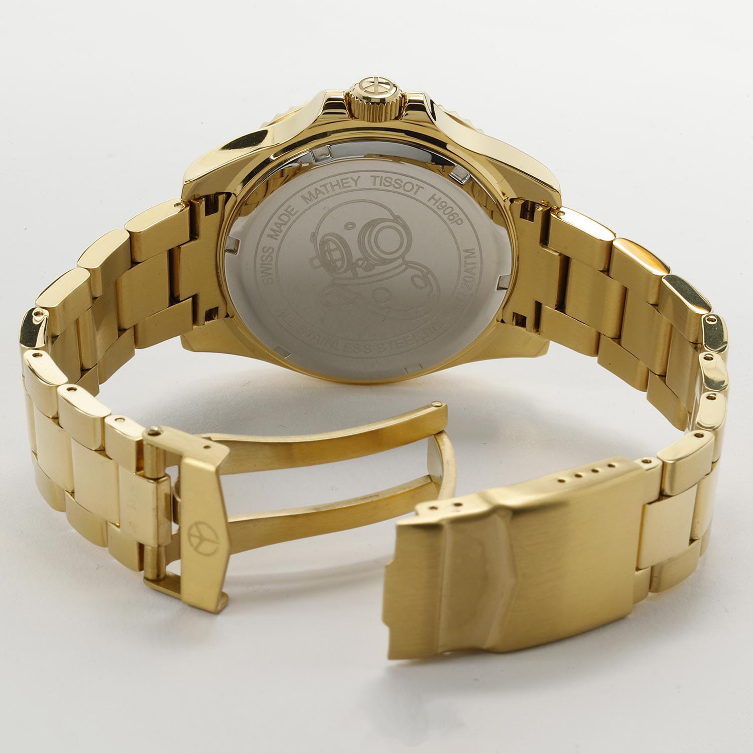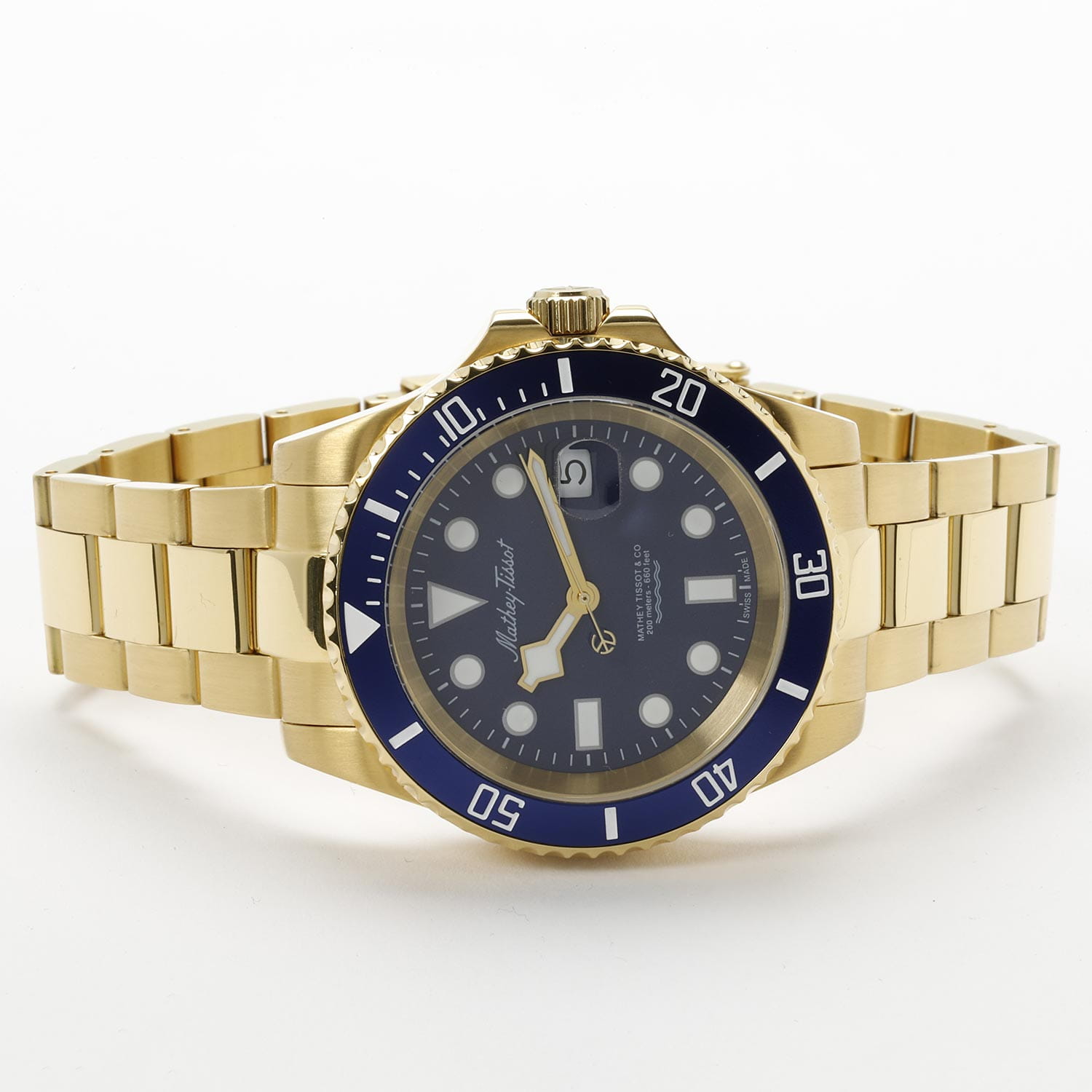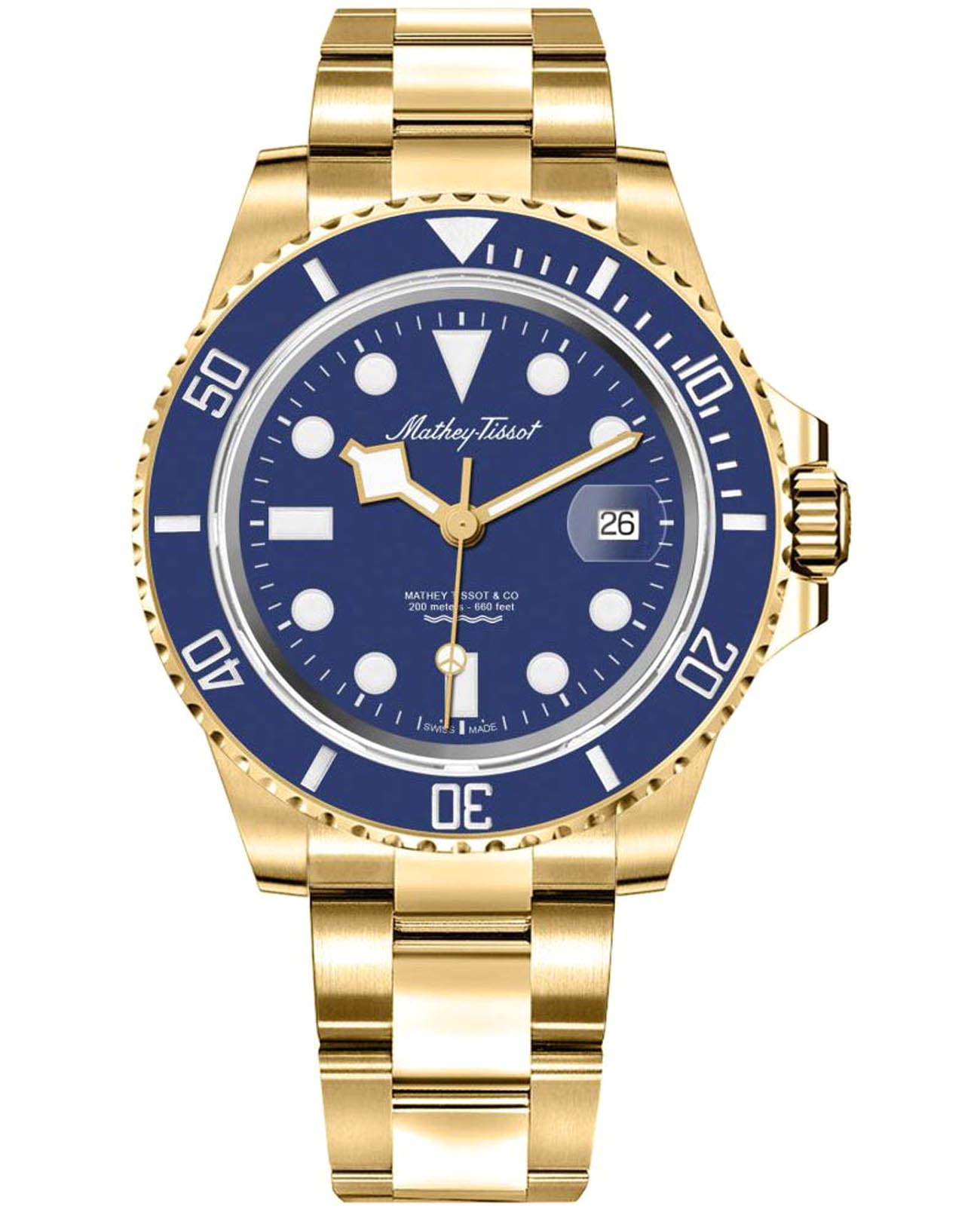Мужские кварцевые часы Mathey-Tissot Mathy H906PBU — это стильное сочетание элегантности и современного дизайна. Изящный корпус выполнен из нержавеющей стали с PVD-покрытиемPVDУльтратонкое покрытие наносится в технике вакуумного напыления, сочетает в себе нитрид титана особой прочности со слоем золота или оксида хрома. Несёт в себе декоративную или защитную функцию. золотистого цвета, диаметром 43,5 мм, что придаст образу элегантности и надежности. Изысканный циферблат с метками в виде точек придает модели особый блеск. Циферблат защищен минеральным стекломМинеральное стеклоМинеральное стекло представляет собой искусственно выращенный минерал кварца. Такое стекло отличается особой устойчивостью к повреждениям и царапинам. Уступает по некоторым качествам сапфировому стеклу. с сапфировым покрытием, обеспечивает устойчивость к царапинам. БезельБезельВнешний ободок, закрепляющий стекло. В спортивных часах так называется поворотное кольцо с делениями на циферблате, выполняет роль таймера – замеряет отрезки времени на шкале. Неподвижный безель – элемент декора. Однонаправленно вращающийся безель на дайверских часах позволяет фиксировать моменты погружения и выныривания на поверхность. с PVD-покрытиемPVDУльтратонкое покрытие наносится в технике вакуумного напыления, сочетает в себе нитрид титана особой прочности со слоем золота или оксида хрома. Несёт в себе декоративную или защитную функцию. синего цвета. Стрелки и метки с люминесцентным покрытиемЛюминесцентное покрытиеПозволяет считывать показания времени в темноте. Производители наносят на стрелки, часовые индексы, безель или поверхность циферблата светонакопительный состав, дающий холодное свечение.. Окошко даты находится в положении 3 часа. Часы оснащены надежным кварцевым механизмом. Стальной браслет на раскладной застёжке с фиксаторомРаскладная застёжкаТакой тип застёжки используется только на браслетах из металла. Она никогда не раскрывается полностью, происходит разделение на 2 и более частей. Раскладывающая застёжка снизит вероятность потери часов к минимуму., гарантирует комфортное и безопасное ношение. Рифленая заводная головка. Класс водозащиты: 200 метров, позволит плавать нырять и заниматься другими водными видами спорта. Mathey-Tissot — отличный выбор для тех, кто ценит утонченность и качество.