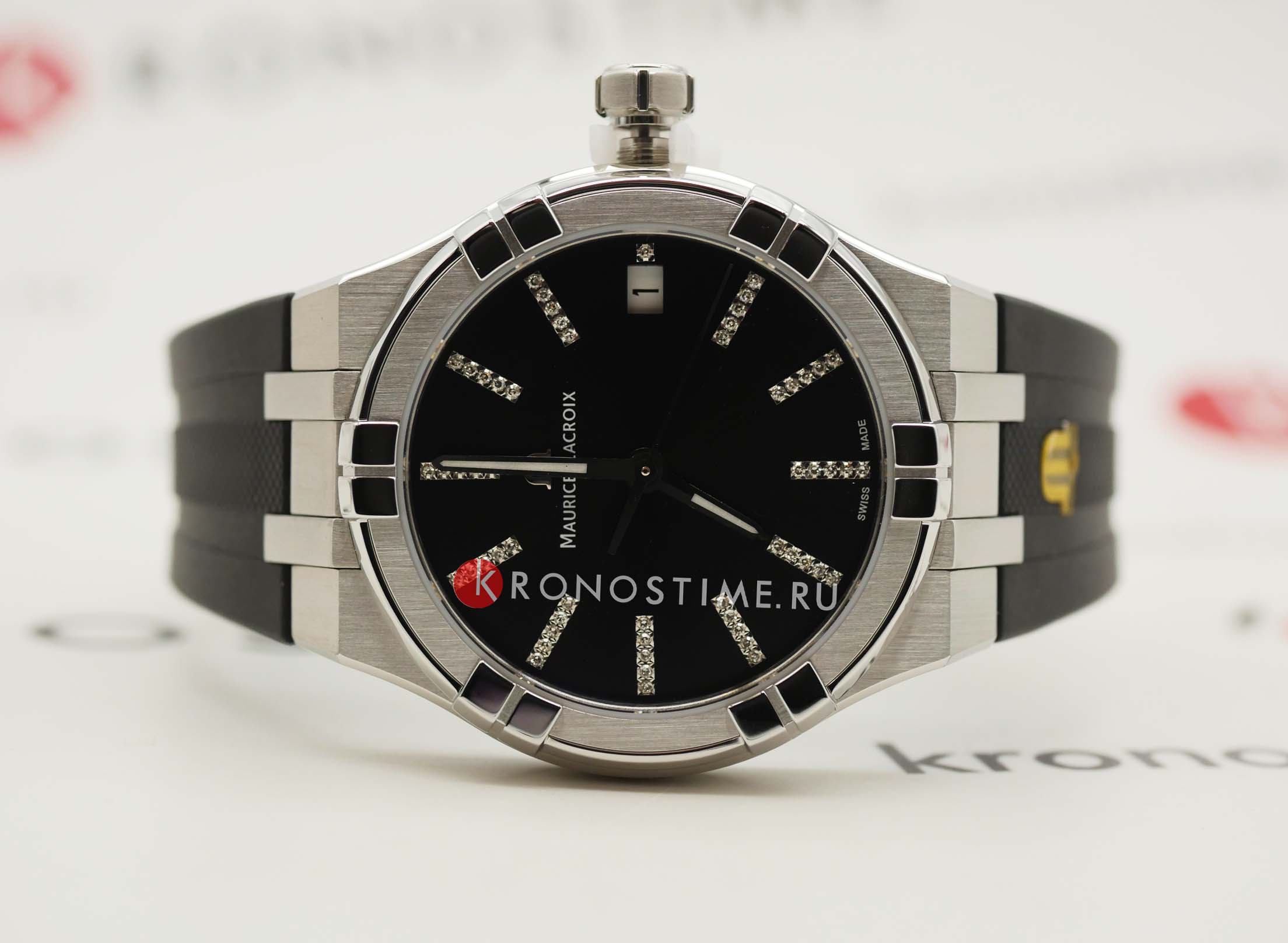 Мужские швейцарские кварцевые часы Maurice Lacroix Aikon Quartz AI1106-SS000-350-2. Сапфировое стеклоСапфировое стеклоПрочный и надёжный материал из кристалла сапфира синтетического происхождения, характеризующийся особой твёрдостью и устойчивостью к царапинам и повреждениям. устойчивое к появлению царапин, обладающее высокой прозрачностью. Черный циферблат. Стрелки с люминесцентным покрытиемЛюминесцентное покрытиеПозволяет считывать показания времени в темноте. Производители наносят на стрелки, часовые индексы, безель или поверхность циферблата светонакопительный состав, дающий холодное свечение.. Метки на циферблате украшены бриллиантами. Класс водозащиты: 100 метров, позволит плавать, нырять и заниматься другими водными видами спорта. Окошко даты находится в положении 3 часов. Корпус и браслет часов изготовлены из стали с частичным. Каучуковый ремешок с классической застежкой.