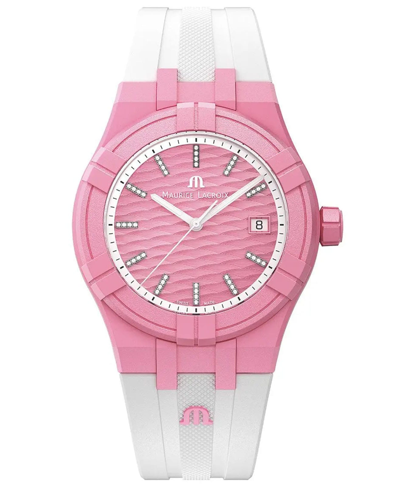 Часы AIKON #tide обладают всеми преимуществами AIKON, но кроме того, они выполнены из особого материала под названием #tideocean – переработанного океанского пластика, усиленного стекловолокном. В результате сложного технологического процесса переработки получен композитный материал, вдвое превосходящий по прочности обычный пластик. Износостойкость композита #tideocean в пять раз выше полиэтилентерефталата (ПЭТ). И еще немаловажный экологический фактор – в процессе превращения океанского пластика в материал #tideocean углеродные выбросы в атмосферу значительно снижаются, чем при обычном процессе выпуска первичного пластика. В новой модели безельБезельВнешний ободок, закрепляющий стекло. В спортивных часах так называется поворотное кольцо с делениями на циферблате, выполняет роль таймера – замеряет отрезки времени на шкале. Неподвижный безель – элемент декора. Однонаправленно вращающийся безель на дайверских часах позволяет фиксировать моменты погружения и выныривания на поверхность., корпус, задняя крышка, заводная головка, наконечник и застежка выполнены из композитного материала #tideocean. 17 пластиковых бутылок требуется для производства одних отличных часов и их специальной упаковки, также на 100% состоящей из материала #tide, появившегося в результате отходов пластика в океане. В результате такой переработки выигрывают все. Унисекс швейцарские кварцевые часы Maurice Lacroix Aikon Quartz AI2008-EEEE1-3A0-0. Сапфировое стеклоСапфировое стеклоПрочный и надёжный материал из кристалла сапфира синтетического происхождения, характеризующийся особой твёрдостью и устойчивостью к царапинам и повреждениям. устойчивое к появлению царапин, обладающее высокой прозрачностью. Розовый циферблат. Стрелки и метки с люминесцентным покрытиемЛюминесцентное покрытиеПозволяет считывать показания времени в темноте. Производители наносят на стрелки, часовые индексы, безель или поверхность циферблата светонакопительный состав, дающий холодное свечение.. Класс водозащиты: 100 метров, позволит плавать, нырять и заниматься другими водными видами спорта. Окошко даты находится в положении 3 часов. Циферблат с тематическим гильошированием "Vagues du Jura". Корпус выполнен из переработанного пластика, ранее загрязнявшего Мировой океан. Каучуковый ремешок с классической застежкой.