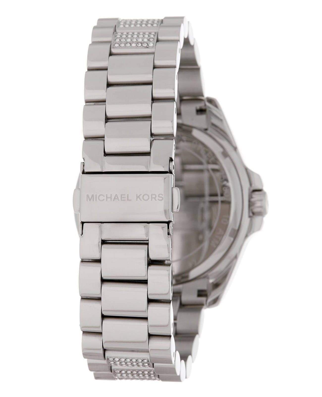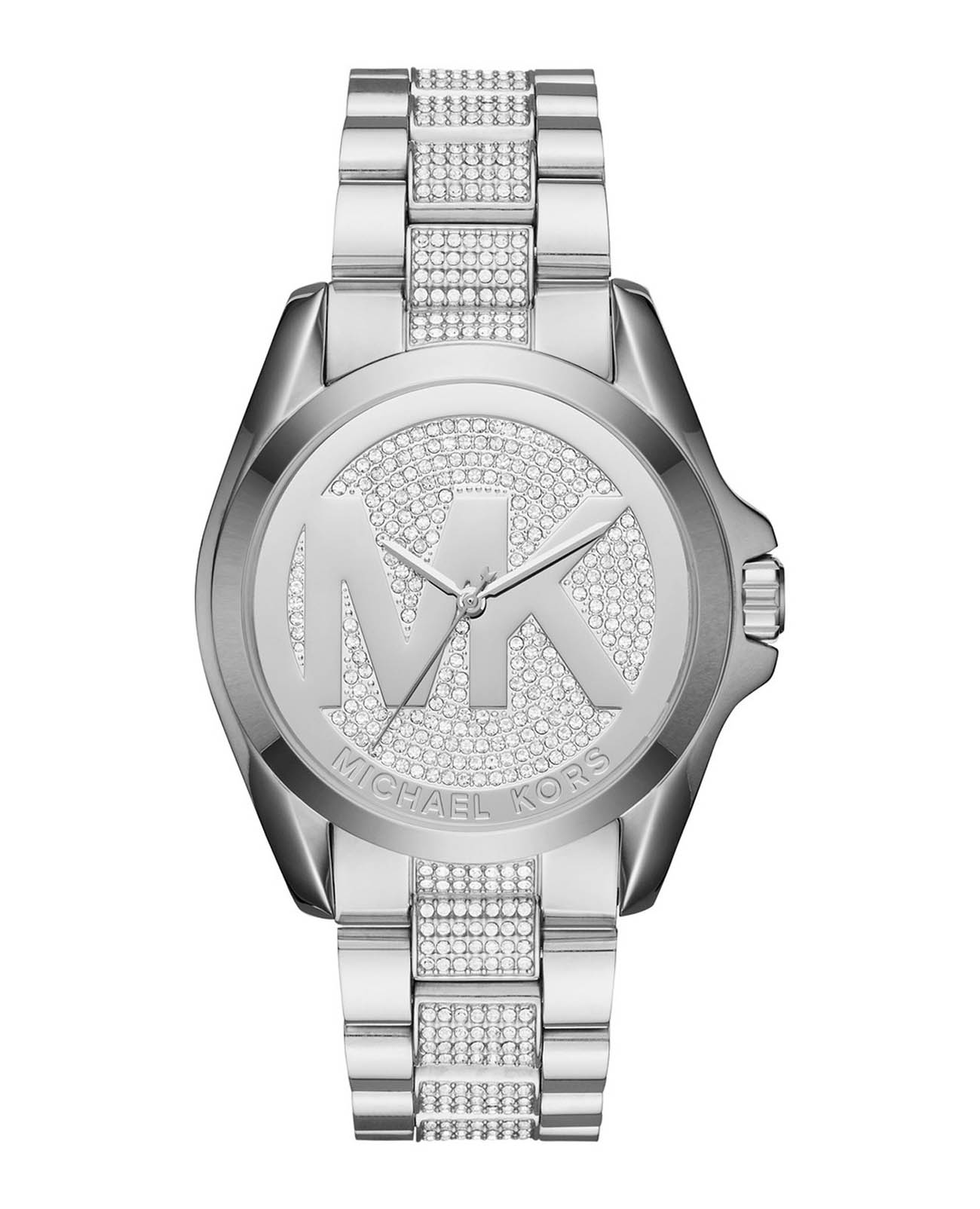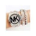 Женские американские часы с минеральным стекломМинеральное стеклоМинеральное стекло представляет собой искусственно выращенный минерал кварца. Такое стекло отличается особой устойчивостью к повреждениям и царапинам. Уступает по некоторым качествам сапфировому стеклу. Michael Kors Bradshaw MK6486, кварцевый механизм с высокой точностью. Корпус часов изготовлен из стали. Циферблат украшен кристаллами. Класс водозащиты: 100 метров, позволит плавать, нырять и заниматься другими водными видами спорта. Стальной браслет на раскладной застёжкеРаскладная застёжкаТакой тип застёжки используется только на браслетах из металла. Она никогда не раскрывается полностью, происходит разделение на 2 и более частей. Раскладывающая застёжка снизит вероятность потери часов к минимуму..