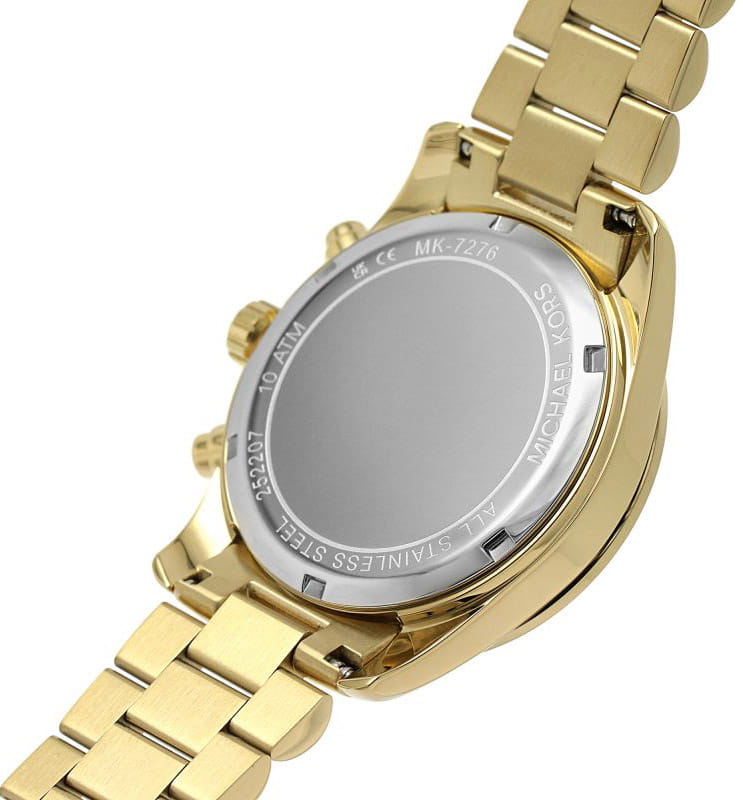 Женские американские наручные часы-хронографХронографФункция позволяет измерять отрезки времени с особой точностью: часы, минуты, секунды. Верным признаком хронографа является наличие на циферблате 3 дополнительных окошек-счётчиков. с секундомеромСекундомерСекундоме́р — прибор, способный измерять интервалы времени с точностью до долей секунды. Michael Kors Lexington MK7276, кварцевый механизм с высокой точностью. Класс водозащиты: 50 метров, позволит защитить корпус от случайных брызг или капель дождя. Корпус часов изготовлен из стали с IP-покрытиемIP-покрытиеМетод ионного напыления. Демонстрирует повышенную устойчивость к истиранию, окислению и химическим веществам. Под воздействием высокого давления и температуры около 1500°C молекулы металла надёжно соединяются с частицами корпуса часов.. Стальной браслет на раскладной застёжкеРаскладная застёжкаТакой тип застёжки используется только на браслетах из металла. Она никогда не раскрывается полностью, происходит разделение на 2 и более частей. Раскладывающая застёжка снизит вероятность потери часов к минимуму. с IP-покрытиемIP-покрытиеМетод ионного напыления. Демонстрирует повышенную устойчивость к истиранию, окислению и химическим веществам. Под воздействием высокого давления и температуры около 1500°C молекулы металла надёжно соединяются с частицами корпуса часов.. БезельБезельВнешний ободок, закрепляющий стекло. В спортивных часах так называется поворотное кольцо с делениями на циферблате, выполняет роль таймера – замеряет отрезки времени на шкале. Неподвижный безель – элемент декора. Однонаправленно вращающийся безель на дайверских часах позволяет фиксировать моменты погружения и выныривания на поверхность. с IP-покрытиемIP-покрытиеМетод ионного напыления. Демонстрирует повышенную устойчивость к истиранию, окислению и химическим веществам. Под воздействием высокого давления и температуры около 1500°C молекулы металла надёжно соединяются с частицами корпуса часов. инкрустирован кристаллами. Окошко даты находится в положении 6 часов.