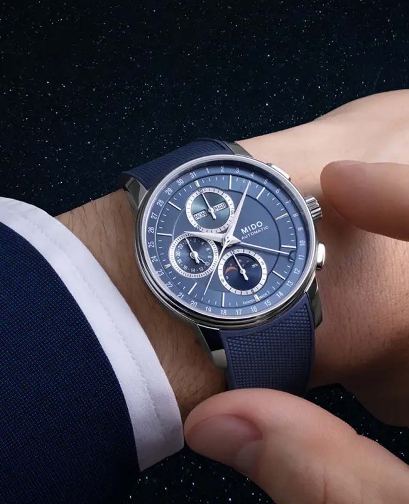 Швейцарские мужские наручные часы Mido Baroncelli MOONPHASE M027.625.17.041.00, механический механизм (автоматический калибр) с высокой точностью. Сапфировое стеклоСапфировое стеклоПрочный и надёжный материал из кристалла сапфира синтетического происхождения, характеризующийся особой твёрдостью и устойчивостью к царапинам и повреждениям. устойчивое к появлению царапин, обладающее высокой прозрачностью. Класс водозащиты: 50 метров, позволит защитить корпус от случайных брызг или капель дождя. Корпус часов изготовлен из стали, серебристого цвета. В модели есть хронографХронографФункция позволяет измерять отрезки времени с особой точностью: часы, минуты, секунды. Верным признаком хронографа является наличие на циферблате 3 дополнительных окошек-счётчиков., 12-часовой счетчик расположен на 6 часов, 30-минутный на 12 часов и малая секунда на 9 часов. Центральная стрелка-указатель даты, апертура месяца и дня недели лаконично расположена на 12 часов, индикатор фазы луны. Эти восхитительные часы оснащены швейцарским автоматическим механизмом . Это Mido Caliber 60 Nivachron , созданный на базе ETA A05. Н31 . Это высокопроизводительный механизм, оснащенный 27 камнями и работающий с частотой 28 800 полуколебаний в час . Это обеспечит правильное функционирование стрелок, счетчиков, а также индикаторов дня, даты и месяца. Запас хода составляет 60 часов.