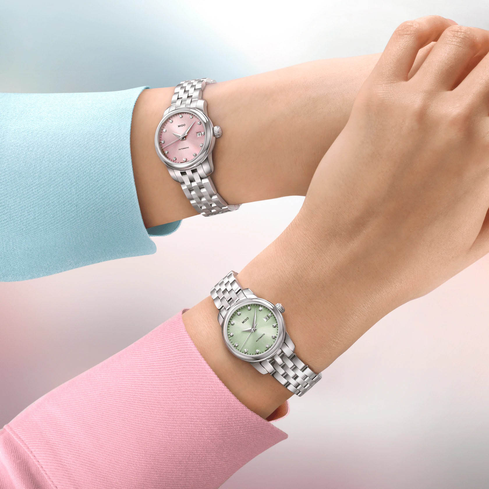 Женские швейцарские механические часы с бриллиантами Mido Baroncelli Lady Twenty Five M039.007.11.336.00, механический механизм (автоматический калибр) с высокой точностью. Сапфировое стеклоСапфировое стеклоПрочный и надёжный материал из кристалла сапфира синтетического происхождения, характеризующийся особой твёрдостью и устойчивостью к царапинам и повреждениям. устойчивое к появлению царапин, обладающее высокой прозрачностью. Циферблат украшен бриллиантами. Класс водозащиты: 50 метров, позволит защитить корпус от случайных брызг или капель дождя. Корпус часов изготовлен из стали.