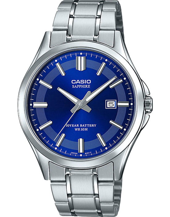 Японские мужские кварцевые часы с сапфировым стекломСапфировое стеклоПрочный и надёжный материал из кристалла сапфира синтетического происхождения, характеризующийся особой твёрдостью и устойчивостью к царапинам и повреждениям. Casio Collection MTS-100D-2A, кварцевый механизм с высокой точностью. Корпус и барслет часов изготовлены из нержавеющей. Подсветка NeobriteПодсветка NeobriteИспользование светонакопительных составов на основе сульфида цинка или алюмината стронция, яркий свет можно наблюдать на протяжении 6-10 часов после «зарядки» часов около источника света. обеспечивает длительное послесвечение в темноте даже после кратковременного нахождения на свету. Окошко даты находится в положении 3 часа. Батарея рассчитана на 10 лет. Заводная головка с защитой. Задняя крышка с винтовым фиксатором. Класс водозащиты: 50 метров, позволит защитить корпус от случайных брызг или капель дождя. Стальной браслет на раскладной застёжкеРаскладная застёжкаТакой тип застёжки используется только на браслетах из металла. Она никогда не раскрывается полностью, происходит разделение на 2 и более частей. Раскладывающая застёжка снизит вероятность потери часов к минимуму..