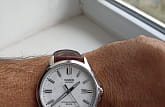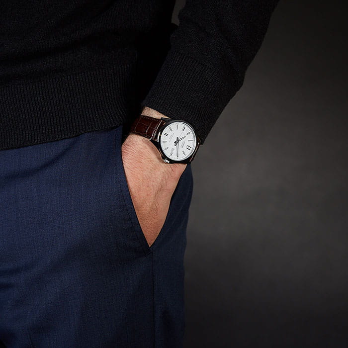 Наручные часы сдержанной расцветки идеальны для ежедневной носки, классический стиль делает их универсальной моделью. Главная особенность заключается в продолжительном сроке службы батарейки, питающей кварцевый механизм - аккумулятор рассчитан на 10 лет эксплуатации. Корпус сделан из хирургической стали 316L, материал устойчив к коррозии. Сапфировое стекло невозможно поцарапать. Люминесцентная подсветкаЛюминесцентное покрытиеПозволяет считывать показания времени в темноте. Производители наносят на стрелки, часовые индексы, безель или поверхность циферблата светонакопительный состав, дающий холодное свечение.. Водонепроницаемость 5 бар. Ремешок из натуральной кожи. Окошко текущего числа. Габариты: 47 x 41,3 x 8,8 мм.