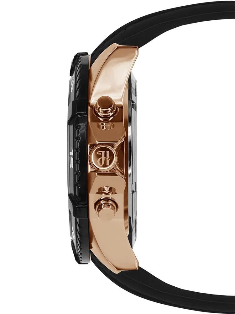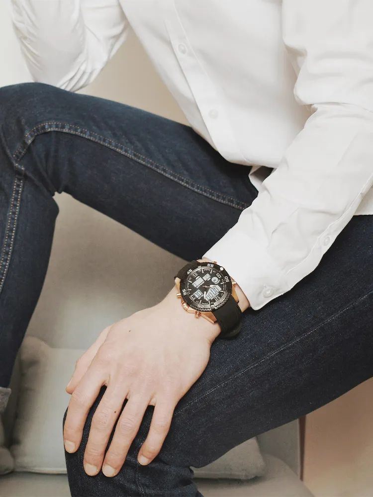 Ремешок выполнен из прочного силикона, обеспечивая комфорт при носке и добавляя модели спортивный характер.  Толщина корпуса составляет 17 мм, что придаёт часам солидный вид.