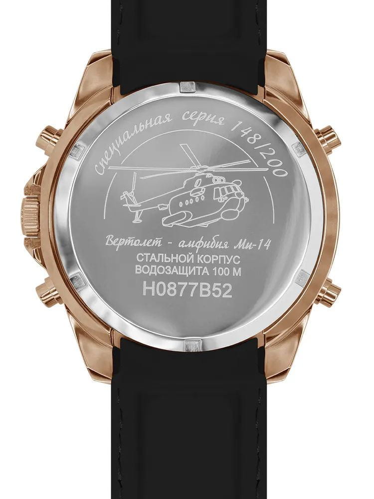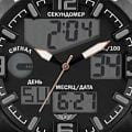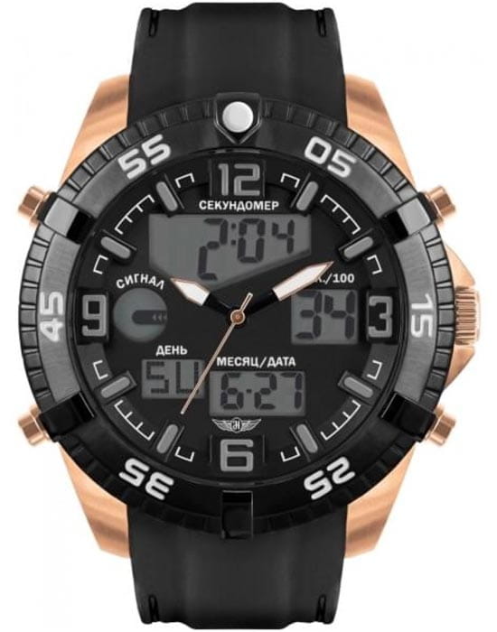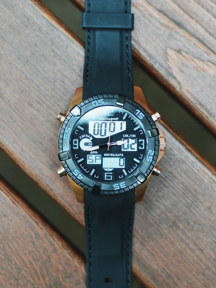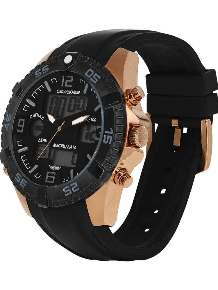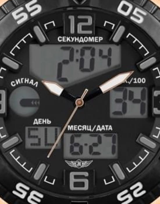 Часы оснащены японским кварцевым механизмом с аналогово-цифровой индикацией, обеспечивая точный ход и дополнительные возможности измерения времени.  Циферблат защищён минеральным стекломМинеральное стеклоМинеральное стекло представляет собой искусственно выращенный минерал кварца. Такое стекло отличается особой устойчивостью к повреждениям и царапинам. Уступает по некоторым качествам сапфировому стеклу., устойчивым к царапинам.  Установлена классическая застёжка-пряжка, обеспечивая надёжную фиксацию на запястье.  Модель обладает водонепроницаемостью до 100 метров, что делает её подходящей для плавания и сноркелинга.