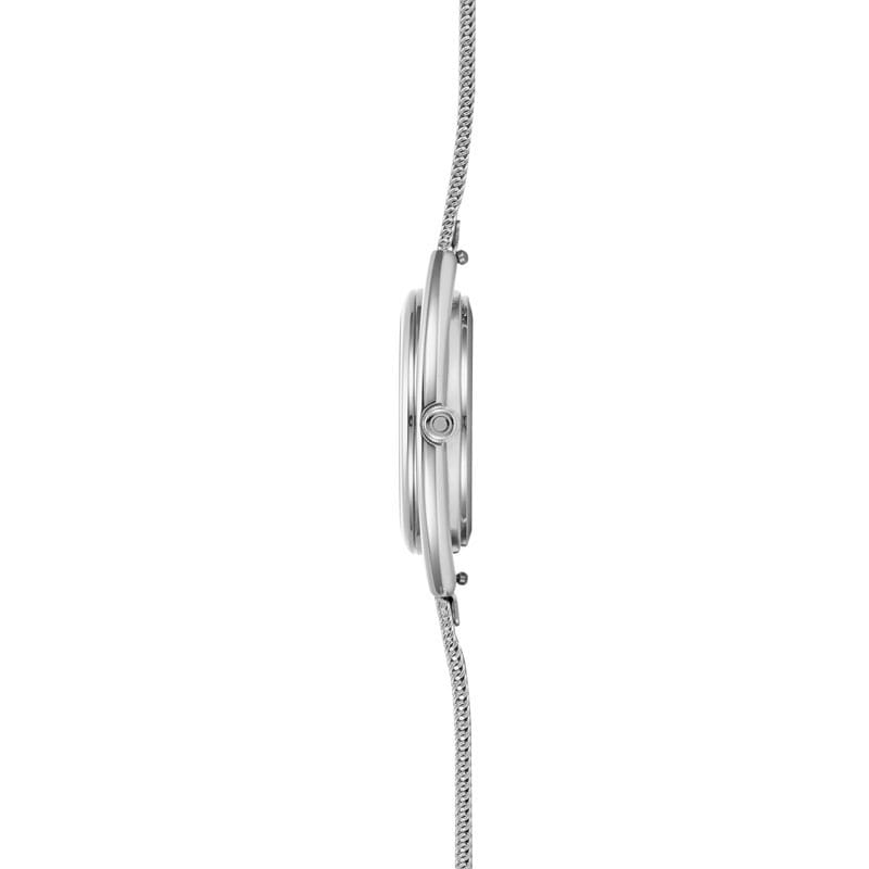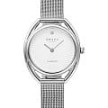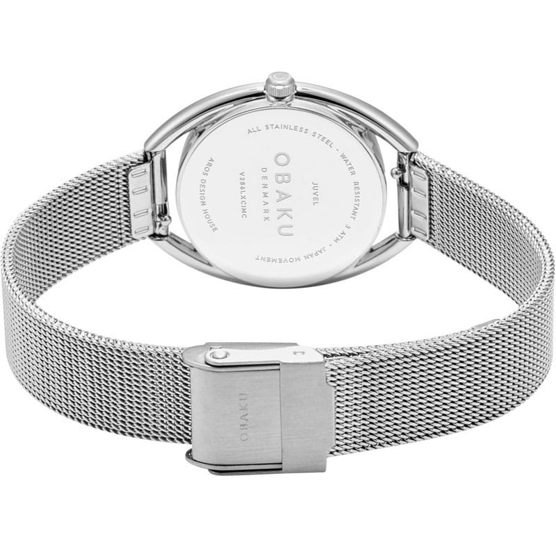 Женские наручные кварцевые часы с минеральным стекломМинеральное стеклоМинеральное стекло представляет собой искусственно выращенный минерал кварца. Такое стекло отличается особой устойчивостью к повреждениям и царапинам. Уступает по некоторым качествам сапфировому стеклу. Obaku Diamond V286LXCIMC, кварцевый механизм с высокой точностью. Класс водозащиты: 30 метров, позволит защитить корпус от случайных брызг или капель дождя. Корпус часов изготовлен из стали. Стальной браслет выполнен в технике миланского плетения на раскладной застёжкеРаскладная застёжкаТакой тип застёжки используется только на браслетах из металла. Она никогда не раскрывается полностью, происходит разделение на 2 и более частей. Раскладывающая застёжка снизит вероятность потери часов к минимуму.. Белый циферблат декорирован бриллиантом.