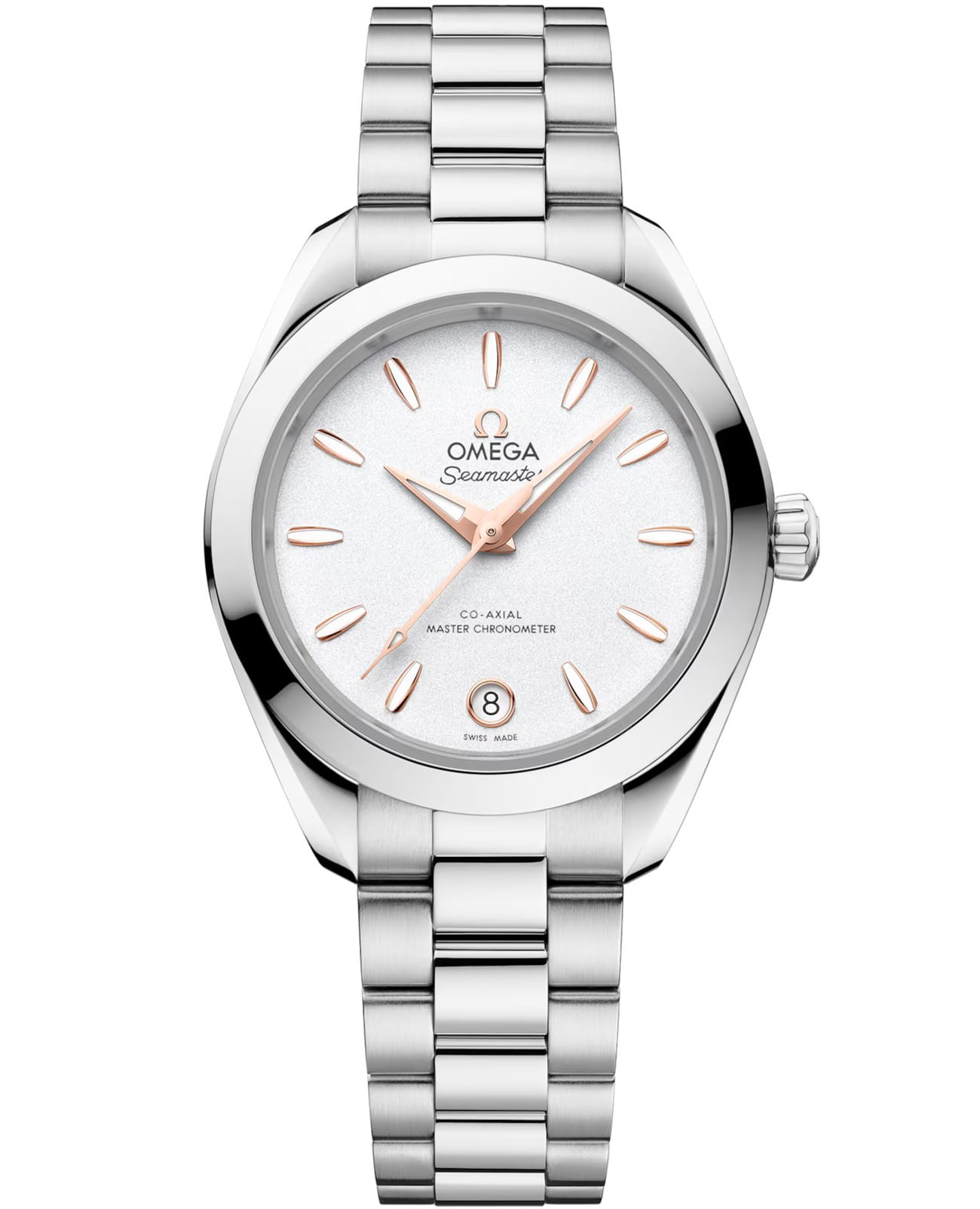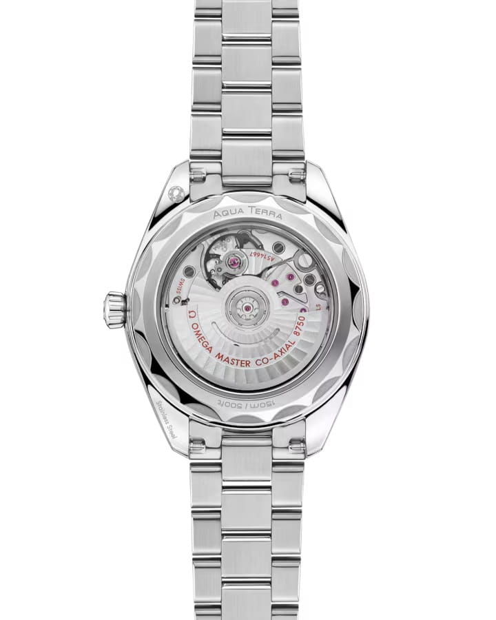 Часы Omega Seamaster Aqua Terra выполнены в симметричном корпусе из нержавеющей стали диаметром 30 мм с завинчивающейся задней крышкой, украшенным волновым узором. Модель оснащена калибром OMEGA 8750 , сертифицированным по высочайшему стандарту METAS, что гарантирует точность и устойчивость к магнитным полям. Циферблат серебристого цвета с кристаллической текстурой дополнен окошком даты на 6 часов и 11 индексами в форме корпусов парусников. Стрелки переработанного дизайна выполнены из золота 18K Sedna™ и дополнены люминесцентным составом Super-LumiNova люминесцентным покрытиемЛюминесцентное покрытиеПозволяет считывать показания времени в темноте. Производители наносят на стрелки, часовые индексы, безель или поверхность циферблата светонакопительный состав, дающий холодное свечение. для отличной читаемости даже в темноте. Защиту циферблата обеспечивает сапфировое стекло сапфировое стеклоСапфировое стеклоПрочный и надёжный материал из кристалла сапфира синтетического происхождения, характеризующийся особой твёрдостью и устойчивостью к царапинам и повреждениям. с антибликовым покрытием антибликовым покрытиемАнтибликовое покрытиеСлой оксида металла в 0,13-0,3 микрон, благодаря которому стекло часов не бликует и не отражает свет. Антибликовое покрытие уменьшает отражение света в 10 раз, обеспечивая отличную читаемость показателей циферблата., браслет из нержавеющей стали — с закруглёнными звеньями и — обеспечивается комфортное отношение. система легкая регулировка комфорта. Водозащита Позволяет использовать часы в воде без повреждений.