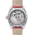 Omega Seamaster Aqua Terra выполнены в симметричном корпусе из нержавеющей стали и 18K Sedna™ золота с завинчивающейся задней крышкой, украшенной волновым узором. Циферблат дополнен окошком даты на 6 часах и 11 бриллиантами в форме маркиз, что добавляет модели роскошный акцент. Стрелки и метки выполнены из 18K Sedna™ золота и оснащены люминесцентным покрытиемЛюминесцентное покрытиеПозволяет считывать показания времени в темноте. Производители наносят на стрелки, часовые индексы, безель или поверхность циферблата светонакопительный состав, дающий холодное свечение. Super-LumiNova для лучшей читаемости в темноте. Калибр Omega 8800 сертифицирован как Master Chronometer — гарантия высочайшей точности и устойчивости к магнитным полям. Запас хода составляет 55 часов. Защиту циферблата обеспечивает сапфировое стеклоСапфировое стеклоПрочный и надёжный материал из кристалла сапфира синтетического происхождения, характеризующийся особой твёрдостью и устойчивостью к царапинам и повреждениям. с антибликовым покрытиемАнтибликовое покрытиеСлой оксида металла в 0,13-0,3 микрон, благодаря которому стекло часов не бликует и не отражает свет. Антибликовое покрытие уменьшает отражение света в 10 раз, обеспечивая отличную читаемость показателей циферблата. с обеих сторон. Водозащита позволяет использовать часы в воде без риска повреждения. Часы установлены на кожаный ремешок красного цвета. Это сочетание премиального качества, технологичности и классического дизайна.