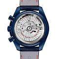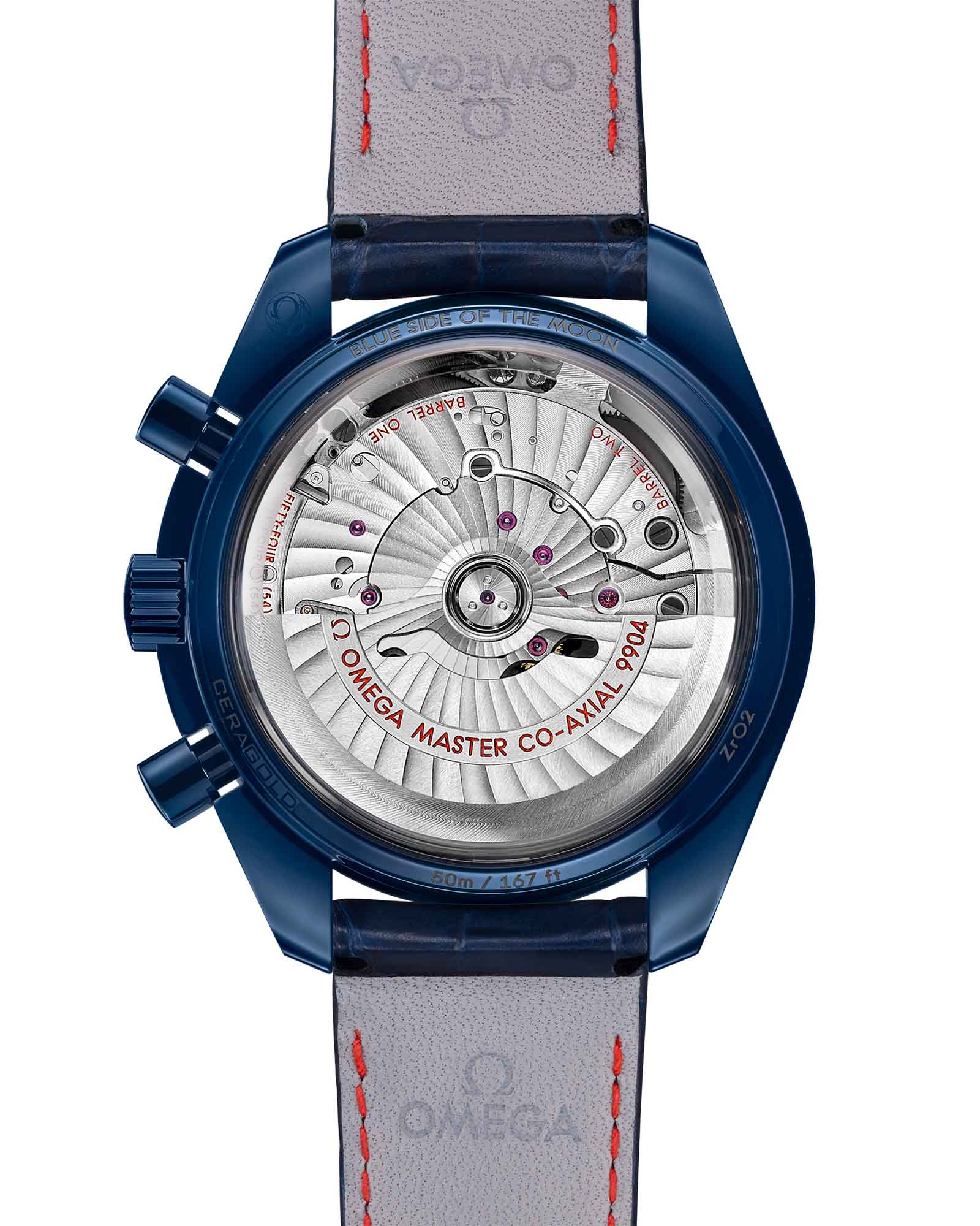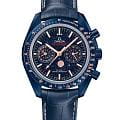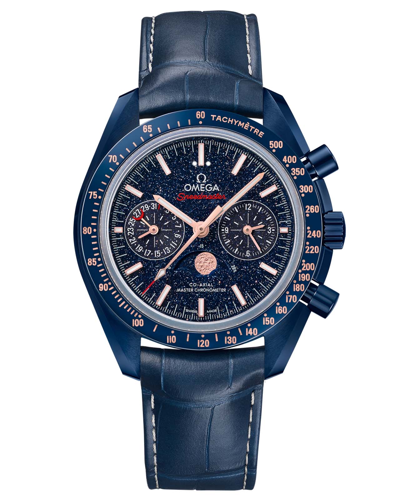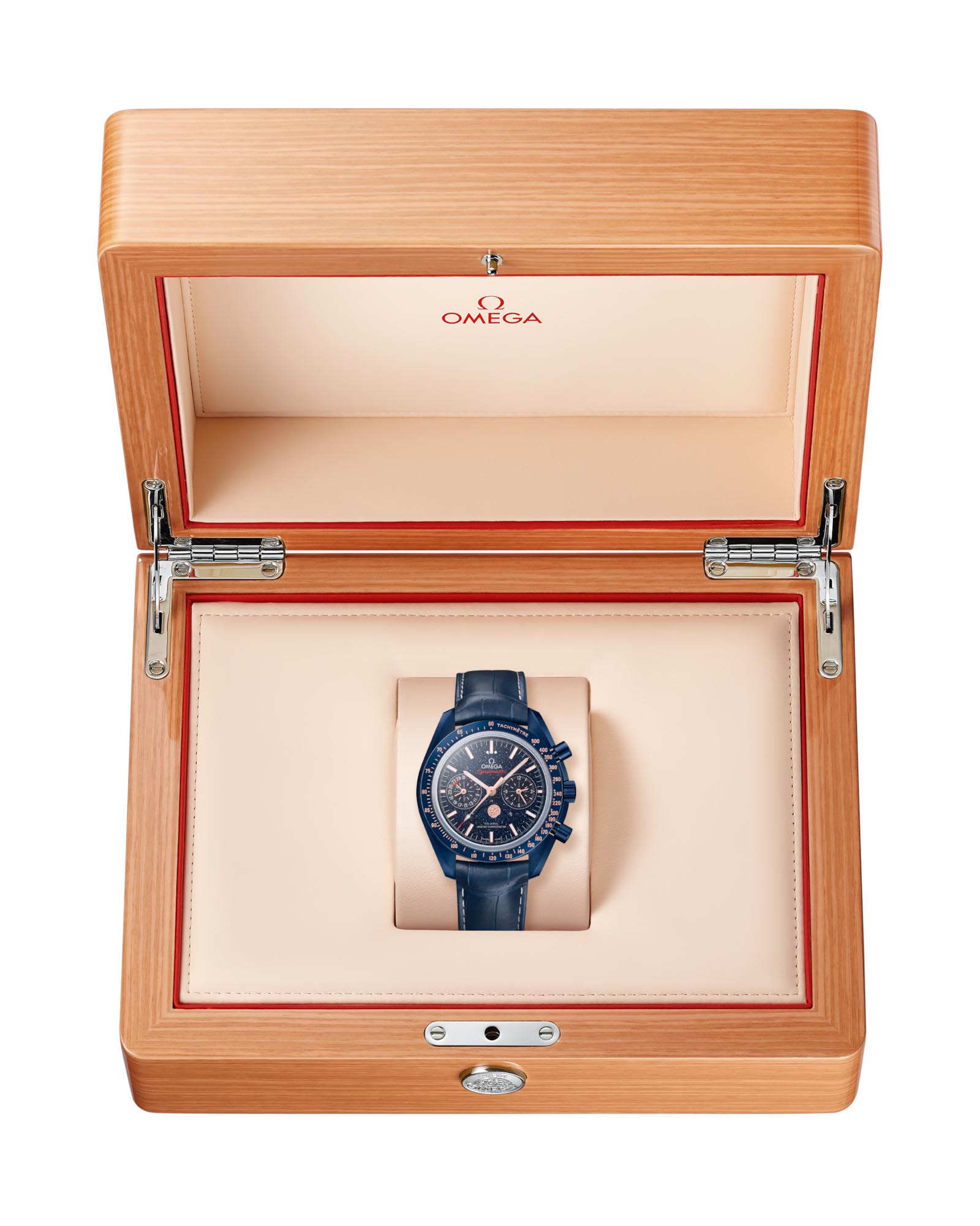 Speedmaster Blue Side of the Moon — дань уважения шести легендарным лунным миссиям, вдохновленная таинственным синим сиянием космоса. 44,25-мм корпус из высокотехнологичной керамики глубокого синего цвета с керамическим безелемБезельВнешний ободок, закрепляющий стекло. В спортивных часах так называется поворотное кольцо с делениями на циферблате, выполняет роль таймера – замеряет отрезки времени на шкале. Неподвижный безель – элемент декора. Однонаправленно вращающийся безель на дайверских часах позволяет фиксировать моменты погружения и выныривания на поверхность., украшенным тахиметрической шкалойТахиметрРазмеченная шкала, располагается на ободке или безеле часов. Тахиметр позволяет рассчитать скорость на определённом участке пути, расстояние измеряется в километрах или милях. из OMEGA Ceragold™, сочетается с синим кожаным ремешком и раскладывающейся застежкой из титана с керамической отделкой. Циферблат из мерцающего авантюринового стекла демонстрирует индексы и стрелки из золота Sedna™18-каратное золотоОбозначение по каратной системе пробирования, оно показывает, сколько драгоценного металла содержится в изделии. 18 карат - в составе 75% чистого золота, соответствует 750 пробе.