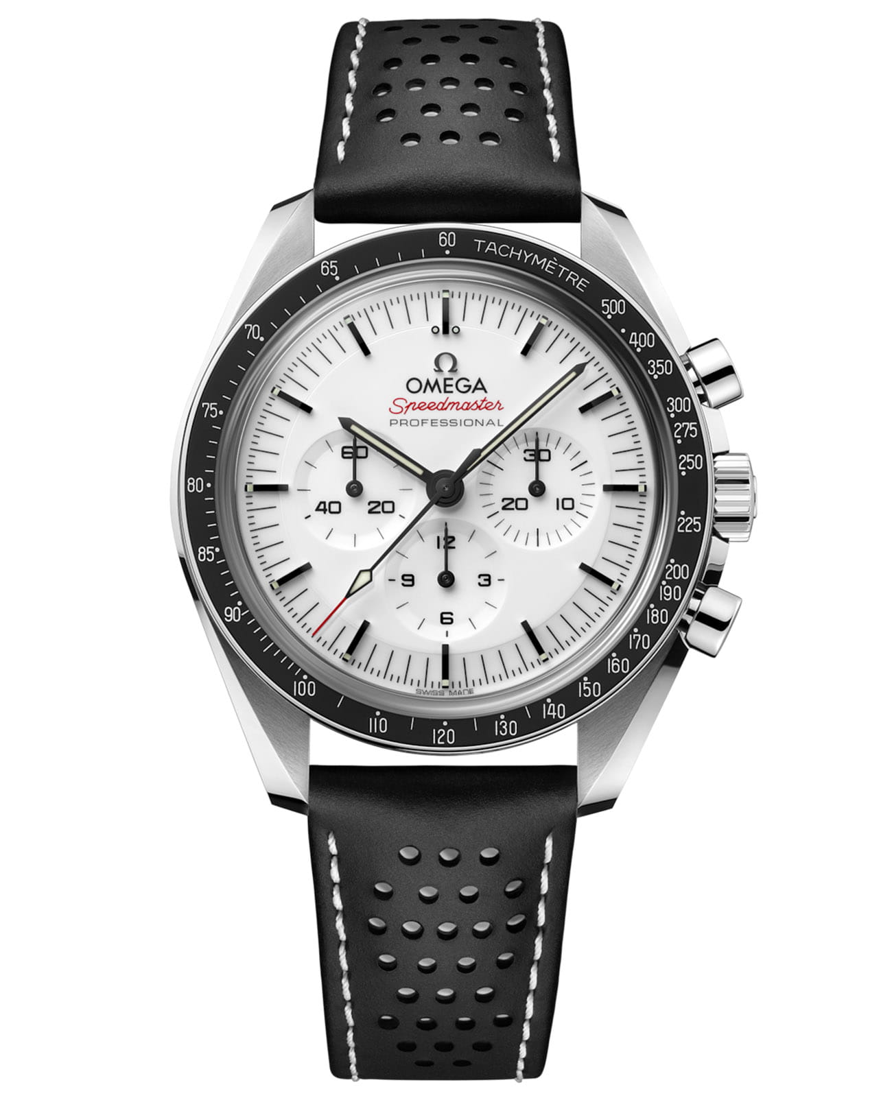 Легендарные Speedmaster Moonwatch – настоящая икона часового искусства. Шесть путешествий на Луну превратили эти часы в символ смелости и инноваций OMEGA. Moonwatch представлены в 42-миллиметровом корпусе из нержавеющей стали с сапфировыми стекламиСапфировое стеклоПрочный и надёжный материал из кристалла сапфира синтетического происхождения, характеризующийся особой твёрдостью и устойчивостью к царапинам и повреждениям. спереди и сзади. Их дизайн вдохновлен четвертым поколением лунных Speedmaster. Асимметричный корпус сочетается с белым лакированным циферблатом, украшенным многоуровневыми индексами и фирменным логотипом OMEGA. Характерные стрелки в стиле Moonwatch и классическая точка у отметки "90" на безелеБезельВнешний ободок, закрепляющий стекло. В спортивных часах так называется поворотное кольцо с делениями на циферблате, выполняет роль таймера – замеряет отрезки времени на шкале. Неподвижный безель – элемент декора. Однонаправленно вращающийся безель на дайверских часах позволяет фиксировать моменты погружения и выныривания на поверхность. из черного анодированного алюминия подчеркивают их аутентичность. Модель дополнена стильным черным кожаным ремешком с микроперфорацией и контрастной красно-белой строчкой. В сердце часов бьется механизм OMEGA Co-Axial Master Chronometer 3861, отвечающий за работу малой секундной стрелки, 30-минутного и 12-часового счетчиков, а также центральной хронографнойХронографФункция позволяет измерять отрезки времени с особой точностью: часы, минуты, секунды. Верным признаком хронографа является наличие на циферблате 3 дополнительных окошек-счётчиков. стрелки.
