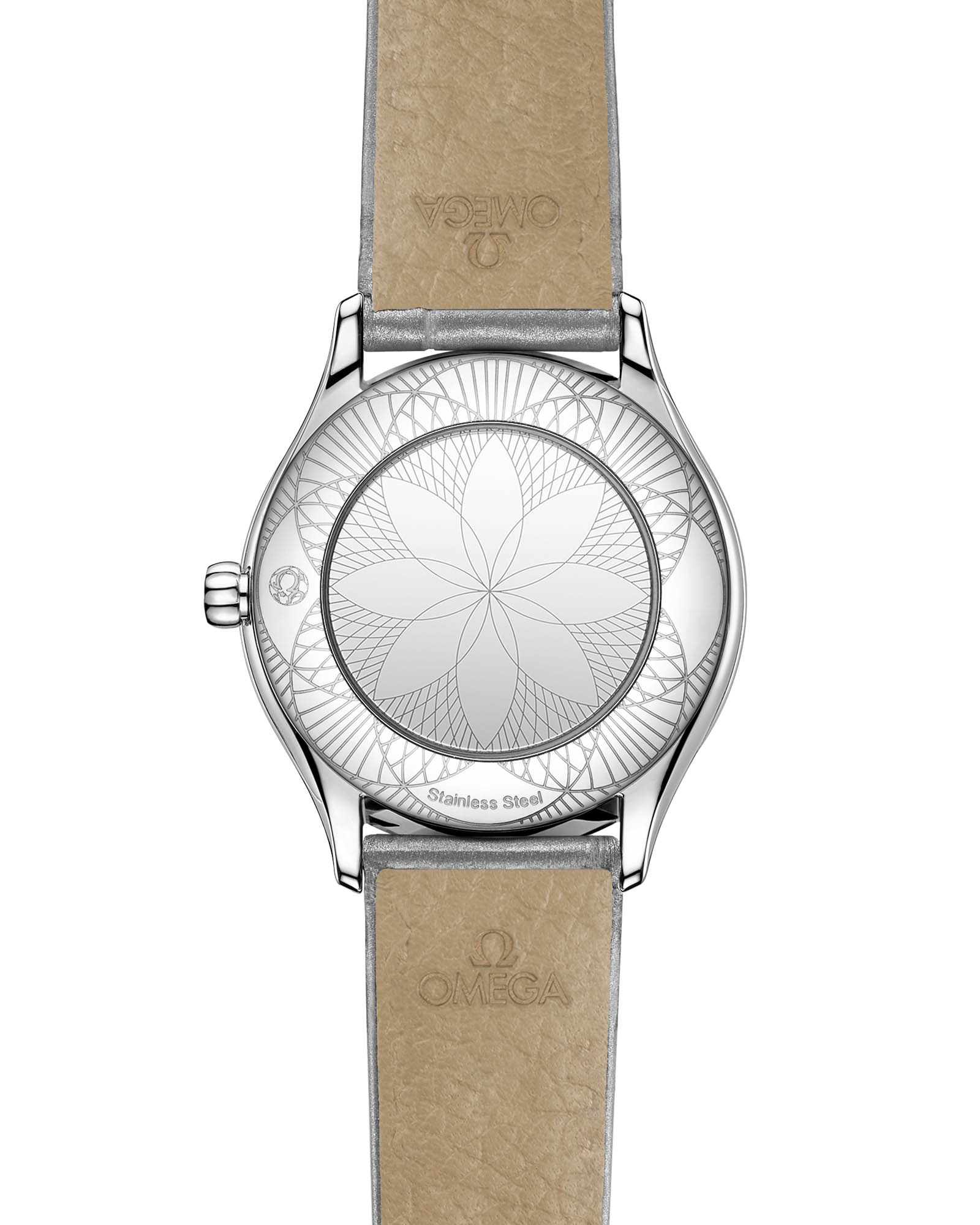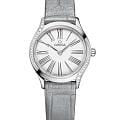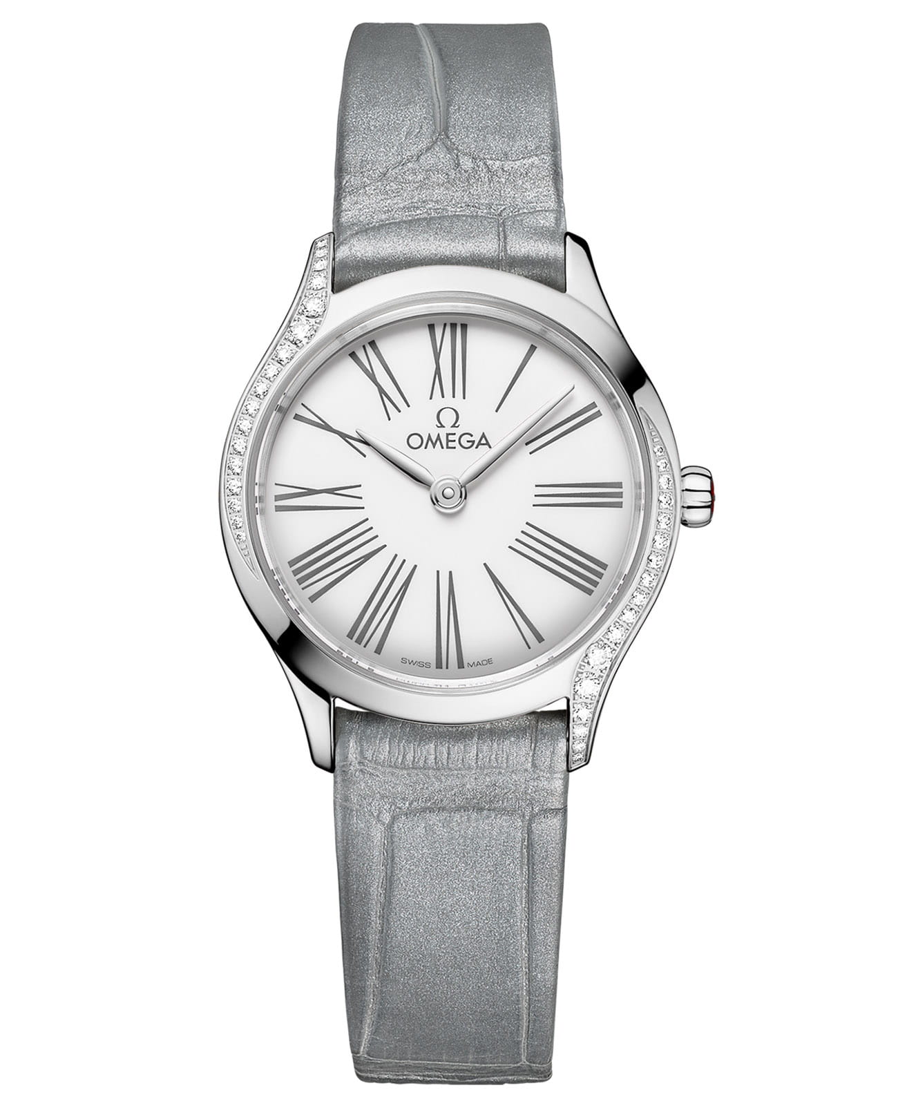Mini Trésor — сияющий бриллиант в короне женской коллекции OMEGA, где 26-мм стальной корпус с волнообразными рядами бриллиантов гармонично сочетается с заводной головкой, украшенной алмазом в обрамлении красной гибридной керамики. Куполообразный циферблат из белой эмали "Grand Feu" с сероватым оттенком и изящными римскими цифрами создает эффект парящей элегантности. серого цвета с фирменной застежкой в стиле Trésor добавляет ноту роскоши, а зеркальная задняя крышка с узором "Her Time" скрывает точный кварцевый механизм OMEGA 4061 — идеальное сочетание ювелирного искусства и часового мастерства.