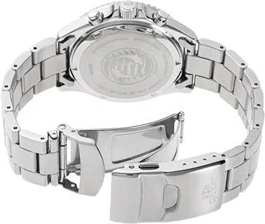 Мужские японские часы-хронограф Orient Automatic RA-TX0202B. Окошко даты находится между отметками 4 и 5 часов.Сапфировое стеклоСапфировое стеклоПрочный и надёжный материал из кристалла сапфира синтетического происхождения, характеризующийся особой твёрдостью и устойчивостью к царапинам и повреждениям.. Класс водозащиты: 200 метров, позволит плавать, нырять и заниматься другими водными видами спорта. Корпус часов изготовлен из стали. Рифленый вращающийся безельБезельВнешний ободок, закрепляющий стекло. В спортивных часах так называется поворотное кольцо с делениями на циферблате, выполняет роль таймера – замеряет отрезки времени на шкале. Неподвижный безель – элемент декора. Однонаправленно вращающийся безель на дайверских часах позволяет фиксировать моменты погружения и выныривания на поверхность. с IP-покрытиемIP-покрытиеМетод ионного напыления. Демонстрирует повышенную устойчивость к истиранию, окислению и химическим веществам. Под воздействием высокого давления и температуры около 1500°C молекулы металла надёжно соединяются с частицами корпуса часов. и с минутной шкалой. Браслет с раскладной застежкойРаскладная застёжкаТакой тип застёжки используется только на браслетах из металла. Она никогда не раскрывается полностью, происходит разделение на 2 и более частей. Раскладывающая застёжка снизит вероятность потери часов к минимуму. и системой блокировки. Метки и стрелки с люминесцентным покрытиемЛюминесцентное покрытиеПозволяет считывать показания времени в темноте. Производители наносят на стрелки, часовые индексы, безель или поверхность циферблата светонакопительный состав, дающий холодное свечение..