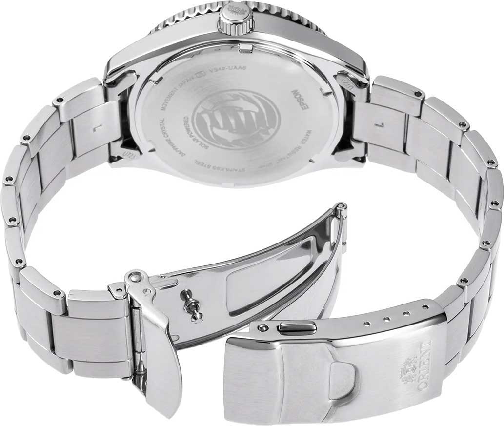 Мужские элегантные кварцевые часы Orient Mako Kamasu RA-WJ0002L выполнены в классическом спортивном стиле и оснащены солнечной батареей. Циферблат оформлен с использованием технологии Sunray (солнечные лучи), обеспечивая эффектный визуальный блеск. Метки в виде штрихов и арабских цифр. Эта изысканная модель имеет люминесцентное покрытиеЛюминесцентное покрытиеПозволяет считывать показания времени в темноте. Производители наносят на стрелки, часовые индексы, безель или поверхность циферблата светонакопительный состав, дающий холодное свечение. на стрелках и метках для отличной читаемости в темноте. Окошко даты расположено в положении 3 часов. Корпус изготовлен из стали. Часы оснащены вращающимся в одном направлении безелемБезельВнешний ободок, закрепляющий стекло. В спортивных часах так называется поворотное кольцо с делениями на циферблате, выполняет роль таймера – замеряет отрезки времени на шкале. Неподвижный безель – элемент декора. Однонаправленно вращающийся безель на дайверских часах позволяет фиксировать моменты погружения и выныривания на поверхность. с алюминиевой вставкой, который удобен при подсчёте времени. Защиту циферблата обеспечивает сапфировое стеклоСапфировое стеклоПрочный и надёжный материал из кристалла сапфира синтетического происхождения, характеризующийся особой твёрдостью и устойчивостью к царапинам и повреждениям., устойчивое к царапинам и повреждениям. Водозащита 200 WR позволяет использовать часы даже при активных водных занятиях. Часы установлены на стальной браслет с раскладной застёжкойРаскладная застёжкаТакой тип застёжки используется только на браслетах из металла. Она никогда не раскрывается полностью, происходит разделение на 2 и более частей. Раскладывающая застёжка снизит вероятность потери часов к минимуму., обеспечивающей надёжную фиксацию на руке. Это сочетание технологичности, прочности и эргономики для уверенных в себе людей.