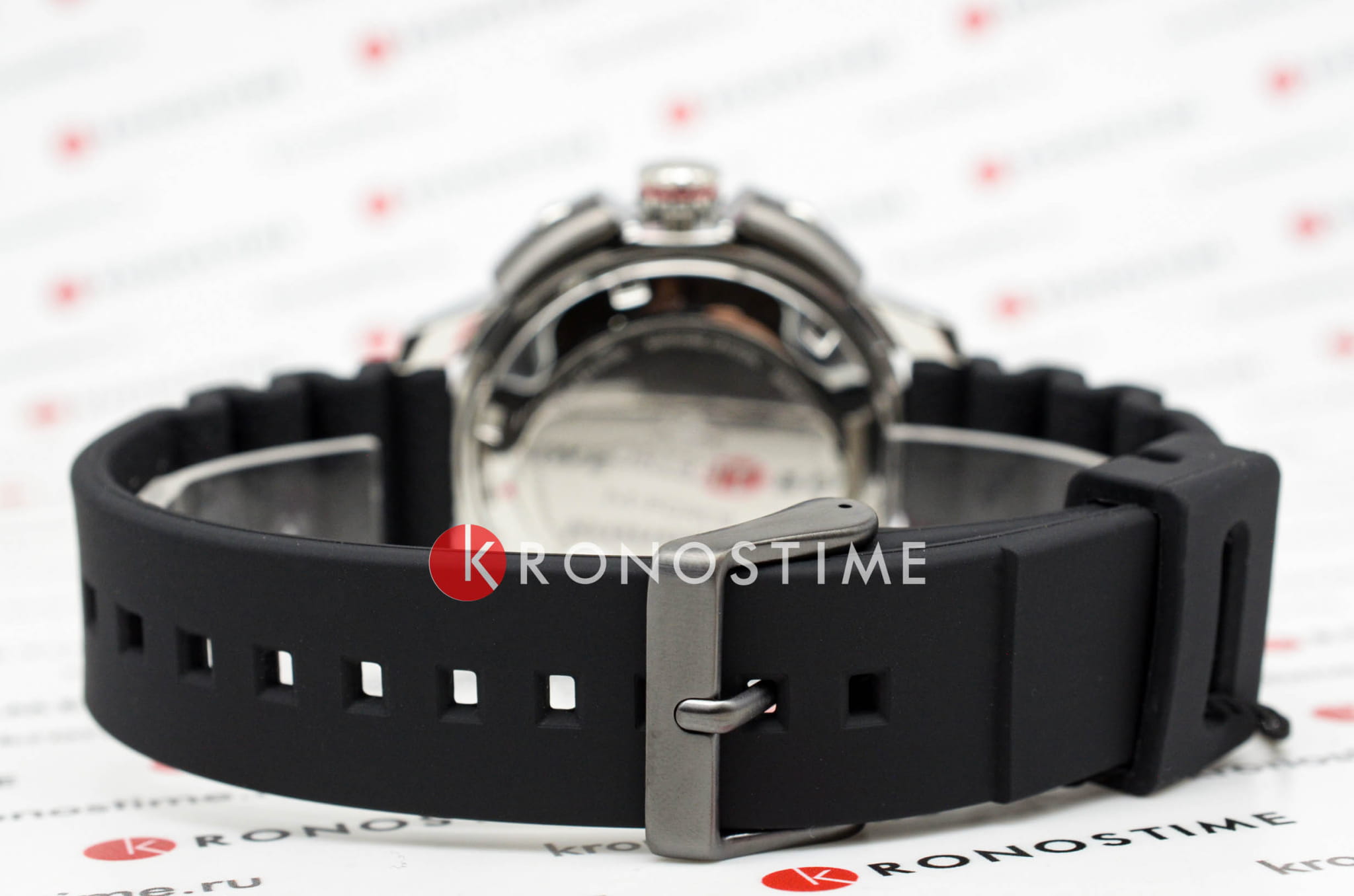 Мужские механические часы с автоподзаводом. Калибр механизма F6722 на 22 камнях. Частота 21 600 полуколебаний в час. Запас хода 40 часов. Центральные часовая, минутная и секундная стрелки. Апертура даты в позиции 3 часов. Синий циферблат. Люминесцентные стрелки и часовые индексы. Круглый корпус выполнен из нержавеющей стали с частичным черным PVD покрытием по безелю. Диаметр корпуса составляет 45 мм. Заводная головка с защитой. Черный каучуковый ремешок, стандартная застежка. Устойчивое к возникновению царапин сапфировое стекло с антибликовым покрытием. Водостойкость WR 200 (погружение с аквалангом).