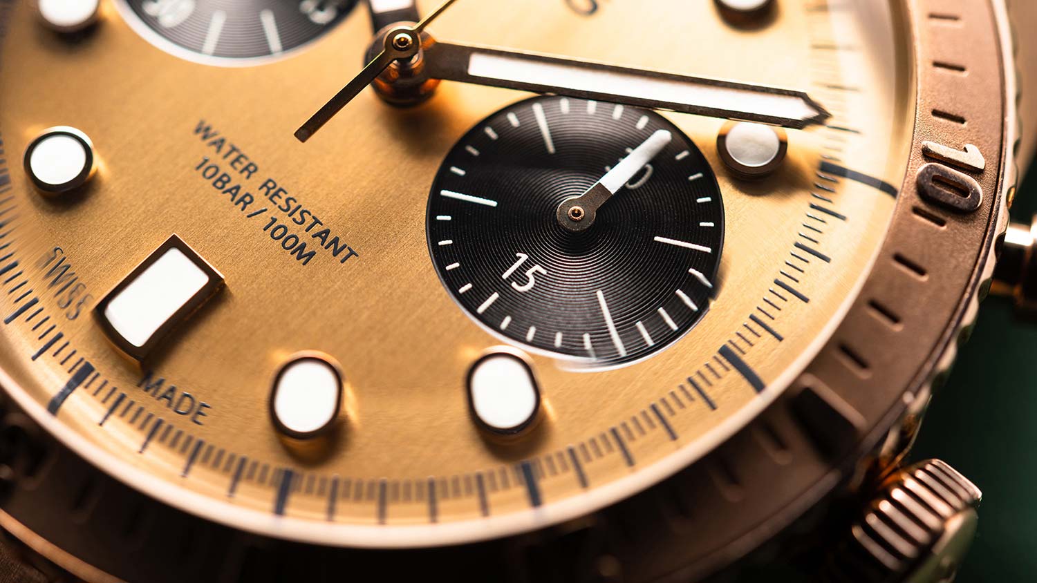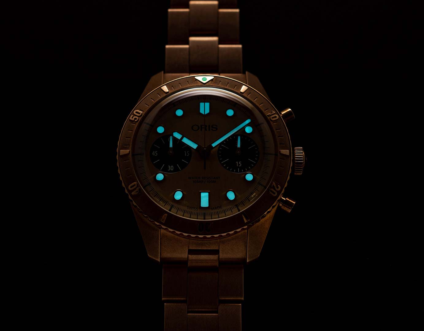 Корпус диаметром 43 мм выполнен из многокомпонентного материала: сочетания бронзы и нержавеющей стали, что придает часам не только прочность, но и особый винтажный шарм. Поворотный ободок с минутной шкалой помогает точно отслеживать продолжительность погружений. Циферблат цвета защищен выпуклым сапфировое стеклоСапфировое стеклоПрочный и надёжный материал из кристалла сапфира синтетического происхождения, характеризующийся особой твёрдостью и устойчивостью к царапинам и повреждениям. с антибликовым покрытиемАнтибликовое покрытиеСлой оксида металла в 0,13-0,3 микрон, благодаря которому стекло часов не бликует и не отражает свет. Антибликовое покрытие уменьшает отражение света в 10 раз, обеспечивая отличную читаемость показателей циферблата., обеспечивающим отличную читаемость показаний даже при ярком освещении.