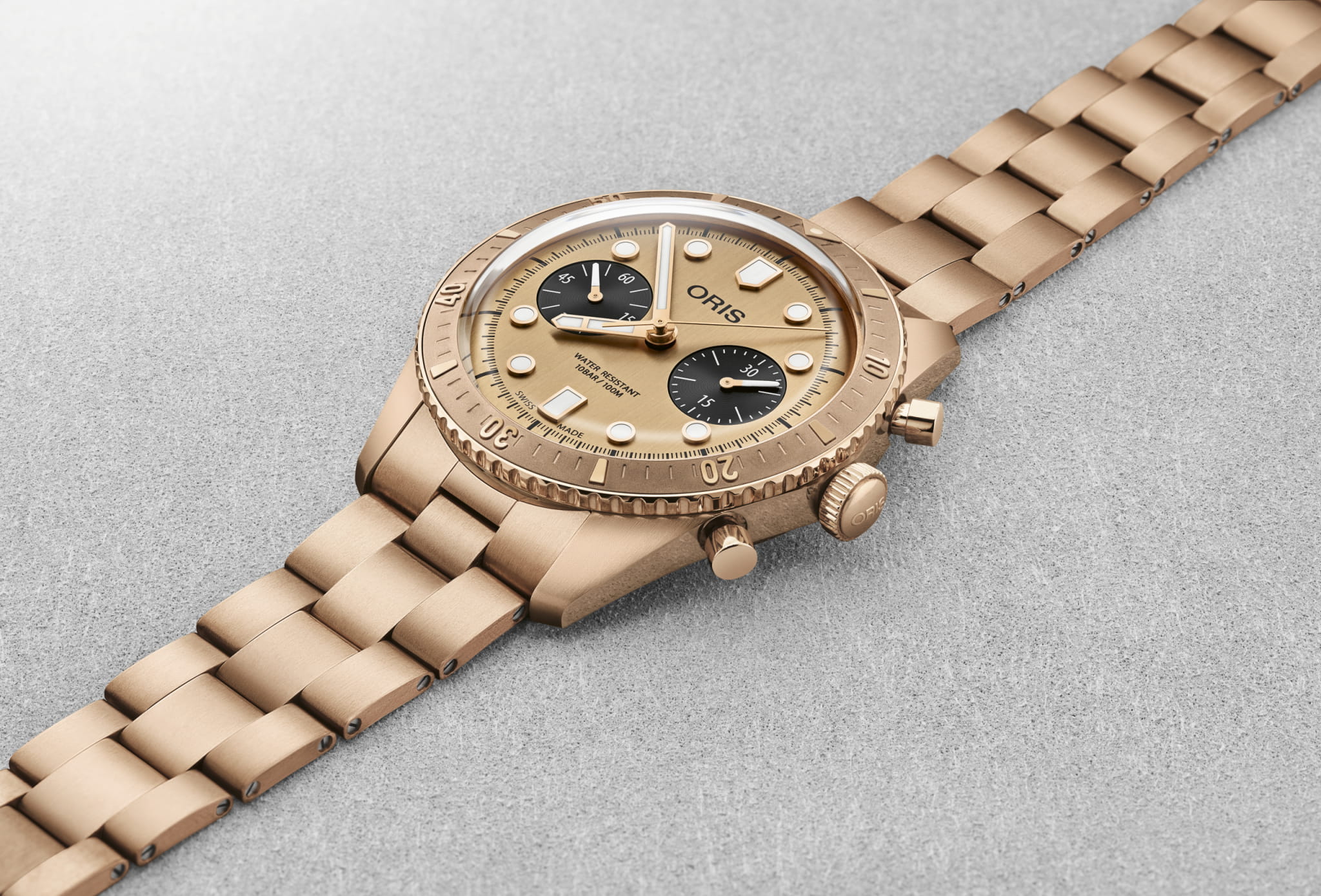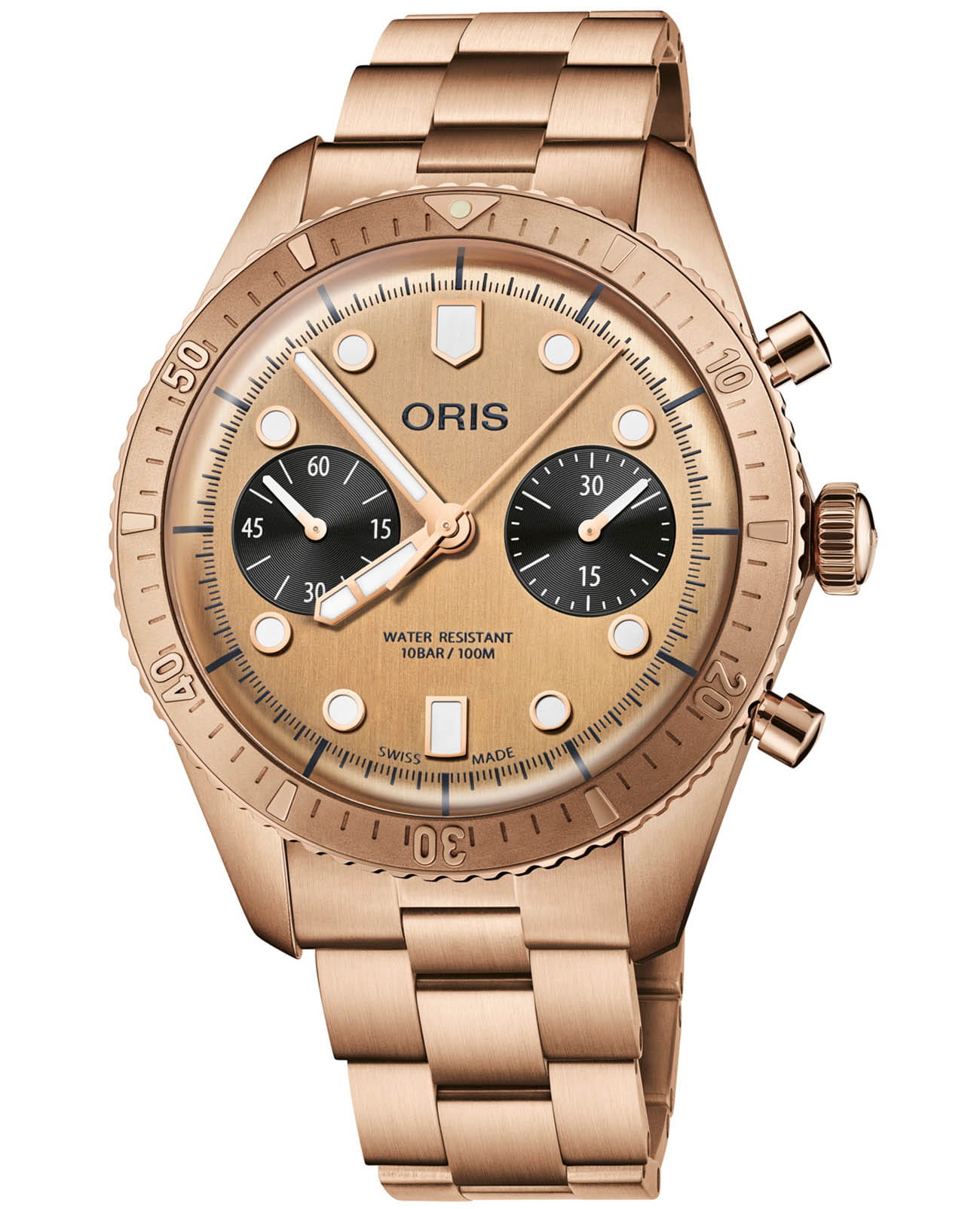 Браслет из бронзовы оснащен раскладывающейся застежкойРаскладная застёжкаТакой тип застёжки используется только на браслетах из металла. Она никогда не раскрывается полностью, происходит разделение на 2 и более частей. Раскладывающая застёжка снизит вероятность потери часов к минимуму., гарантирующей комфортную фиксацию на запястье. Завинчивающаяся задняя крышка из нержавеющей стали с специальной гравировкой и завинчивающаяся заводная головка обеспечивают водонепроницаемость до 10 бар (WR100), что делает эти часы идеальными для плавания и других водных видов спорта.