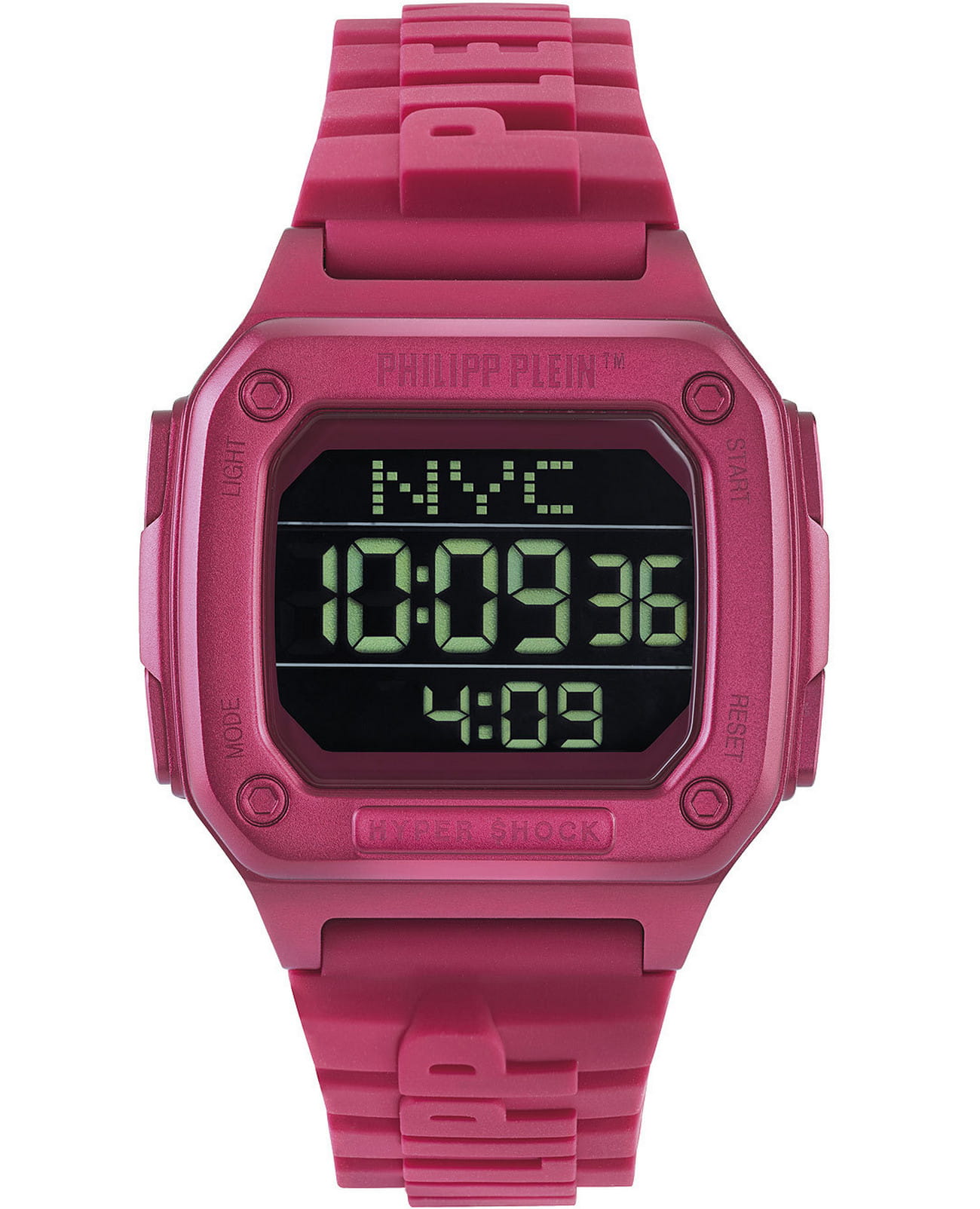 Электронные унисекс часы-хронографХронографФункция позволяет измерять отрезки времени с особой точностью: часы, минуты, секунды. Верным признаком хронографа является наличие на циферблате 3 дополнительных окошек-счётчиков. Philipp Plein Hyper Shock PWHAA0121, электронный механизм с высокой точностью. Класс водозащиты: 50 метров, позволит защитить корпус от случайных брызг или капель дождя. Прямоугольный корпус выполнен из нержавеющей стали с IP-покрытиемIP-покрытиеМетод ионного напыления. Демонстрирует повышенную устойчивость к истиранию, окислению и химическим веществам. Под воздействием высокого давления и температуры около 1500°C молекулы металла надёжно соединяются с частицами корпуса часов. розового цвета. Силиконовый ремешок шириной 22 мм, со стандартной застежкой.