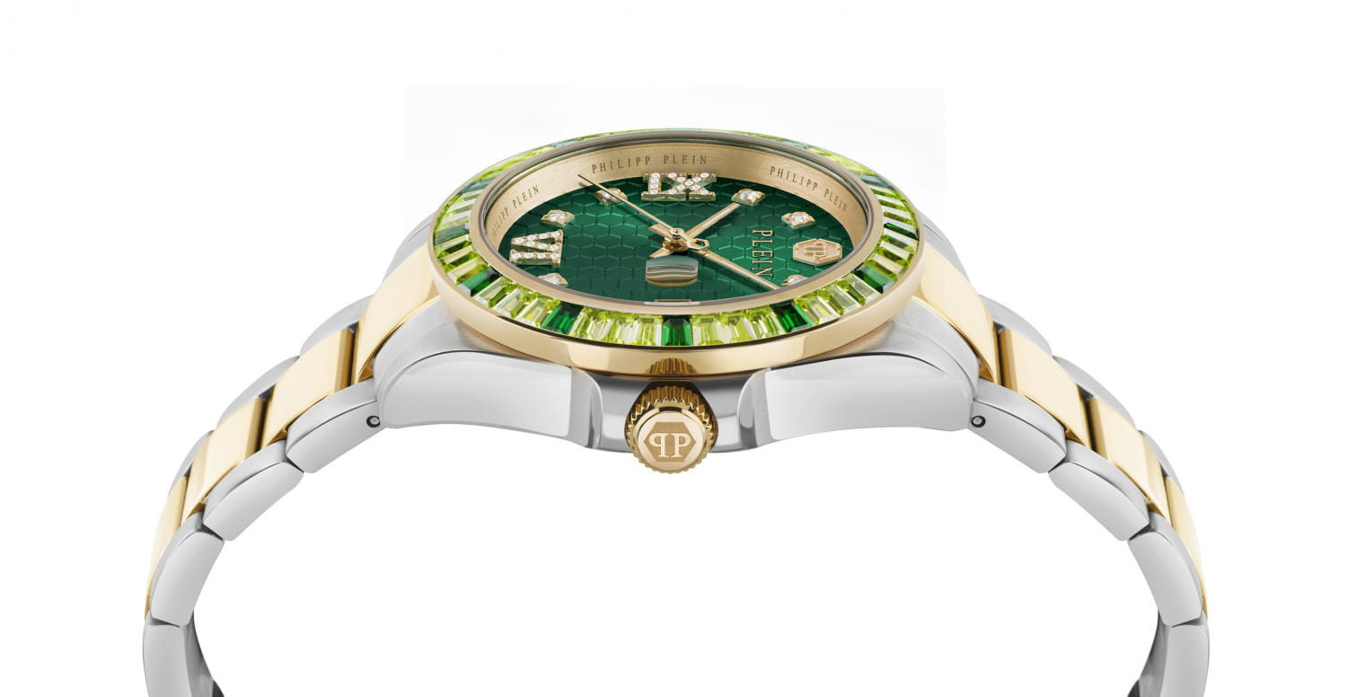 Женские кварцевые часы Philipp Plein Lady Empire PW2FA0225 — это стильное сочетание элегантности и современного дизайна. Изящный корпус выполнен из нержавеющей стали, диаметром 39 мм, что придаст образу женственности и романтизма. Изысканный циферблат с метками в виде точек и римских цифр придает модели особый блеск. Циферблат защищен минеральным стекломМинеральное стеклоМинеральное стекло представляет собой искусственно выращенный минерал кварца. Такое стекло отличается особой устойчивостью к повреждениям и царапинам. Уступает по некоторым качествам сапфировому стеклу., обеспечивающий устойчивость к царапинам и украшен кристаллами. Стрелки с люминесцентным покрытиемЛюминесцентное покрытиеПозволяет считывать показания времени в темноте. Производители наносят на стрелки, часовые индексы, безель или поверхность циферблата светонакопительный состав, дающий холодное свечение.. Окошко даты находится в положении 3 часа. БезельБезельВнешний ободок, закрепляющий стекло. В спортивных часах так называется поворотное кольцо с делениями на циферблате, выполняет роль таймера – замеряет отрезки времени на шкале. Неподвижный безель – элемент декора. Однонаправленно вращающийся безель на дайверских часах позволяет фиксировать моменты погружения и выныривания на поверхность. с PVD-покрытиемPVDУльтратонкое покрытие наносится в технике вакуумного напыления, сочетает в себе нитрид титана особой прочности со слоем золота или оксида хрома. Несёт в себе декоративную или защитную функцию. украшен цирконами. Часы оснащены надежным кварцевым механизмом. Стальной браслет с частичным PVD-покрытиемPVDУльтратонкое покрытие наносится в технике вакуумного напыления, сочетает в себе нитрид титана особой прочности со слоем золота или оксида хрома. Несёт в себе декоративную или защитную функцию. на застёжке-бабочке с кнопкамиЗастёжка "бабочка"Такой вид застёжки дополняется предохранителями, помогающими избежать случайного раскрытия браслета. Обладают изящным исполнением. , гарантирует комфортное и безопасное ношение. Класс водозащиты: 50 метров позволит защитить корпус от случайных брызг или капель дождя. Phlipp Plein — отличный выбор для тех, кто ценит яркость и качество.