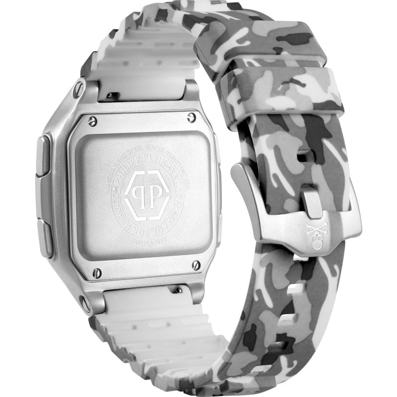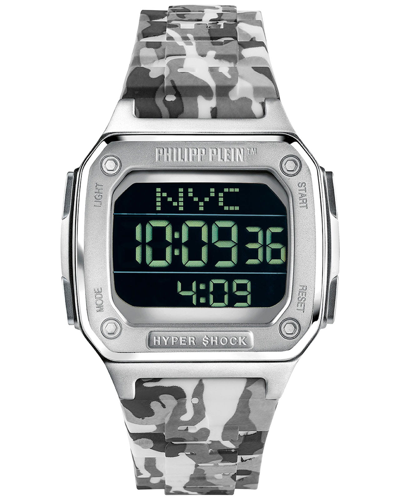 Электронные унисекс часы с секундомеромСекундомерСекундоме́р — прибор, способный измерять интервалы времени с точностью до долей секунды. Philipp Plein Hyper Shock PWHAA1522, электронный механизм с высокой точностью. Класс водозащиты: 50 метров, позволит защитить корпус от случайных брызг или капель дождя. Прямоугольный корпус выполнен из нержавеющей стали. Силиконовый ремешок цвета камуфляж (бело-серый) шириной 22 мм, стандартная застежка.