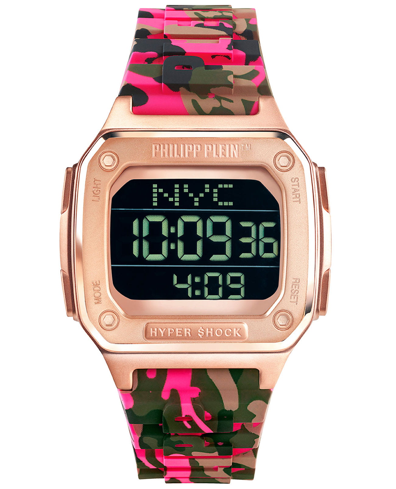 Электронные унисекс часы с секундомеромСекундомерСекундоме́р — прибор, способный измерять интервалы времени с точностью до долей секунды. Philipp Plein Hyper Shock PWHAA1622, электронный механизм с высокой точностью. Класс водозащиты: 50 метров, позволит защитить корпус от случайных брызг или капель дождя. Прямоугольный корпус выполнен из нержавеющей стали с IP-покрытиемIP-покрытиеМетод ионного напыления. Демонстрирует повышенную устойчивость к истиранию, окислению и химическим веществам. Под воздействием высокого давления и температуры около 1500°C молекулы металла надёжно соединяются с частицами корпуса часов. цвета розовое золото. Силиконовый ремешок цвета камуфляж (розово-зеленый) шириной 22 мм, стандартная застежка.