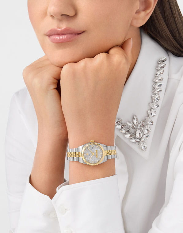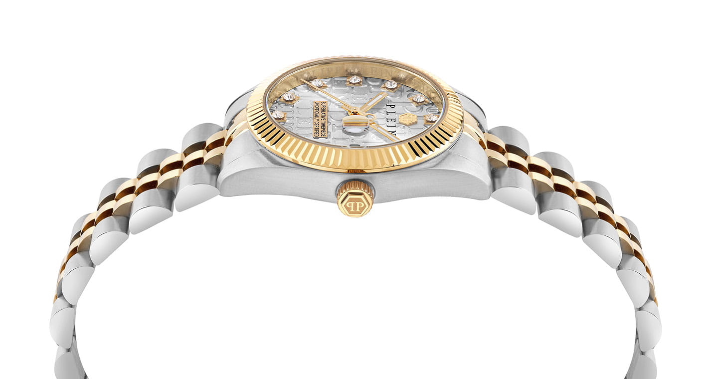Philipp Plein DATE SUPERLATIVE PWNFA0425 - дерзкое заявление любви к роскоши и бунтарскому стилю. Диаметр круглого корпуса из прочной нержавеющей стали равен 28 мм. Стальной браслет на застёжке «бабочка» с кнопкамиЗастёжка "бабочка"Такой вид застёжки дополняется предохранителями, помогающими избежать случайного раскрытия браслета. Обладают изящным исполнением. обеспечивает надёжную фиксацию и комфортное ношение. Метки в виде кристаллов Preciosa. Минеральное стеклоМинеральное стеклоМинеральное стекло представляет собой искусственно выращенный минерал кварца. Такое стекло отличается особой устойчивостью к повреждениям и царапинам. Уступает по некоторым качествам сапфировому стеклу. защищает циферблат от царапин. Люминесцентное покрытиеЛюминесцентное покрытиеПозволяет считывать показания времени в темноте. Производители наносят на стрелки, часовые индексы, безель или поверхность циферблата светонакопительный состав, дающий холодное свечение. стрелок и меток позволит следить за временем даже в полной темноте. БезельБезельВнешний ободок, закрепляющий стекло. В спортивных часах так называется поворотное кольцо с делениями на циферблате, выполняет роль таймера – замеряет отрезки времени на шкале. Неподвижный безель – элемент декора. Однонаправленно вращающийся безель на дайверских часах позволяет фиксировать моменты погружения и выныривания на поверхность. с PVD-покрытиемPVDУльтратонкое покрытие наносится в технике вакуумного напыления, сочетает в себе нитрид титана особой прочности со слоем золота или оксида хрома. Несёт в себе декоративную или защитную функцию.. Граненая заводная головка. Влагозащита: 50 метров, позволит защитить корпус от случайных брызг или капель дождя. Идеальный аксессуар для тех, кто ценит индивидуальность и не боится выделяться из толпы.