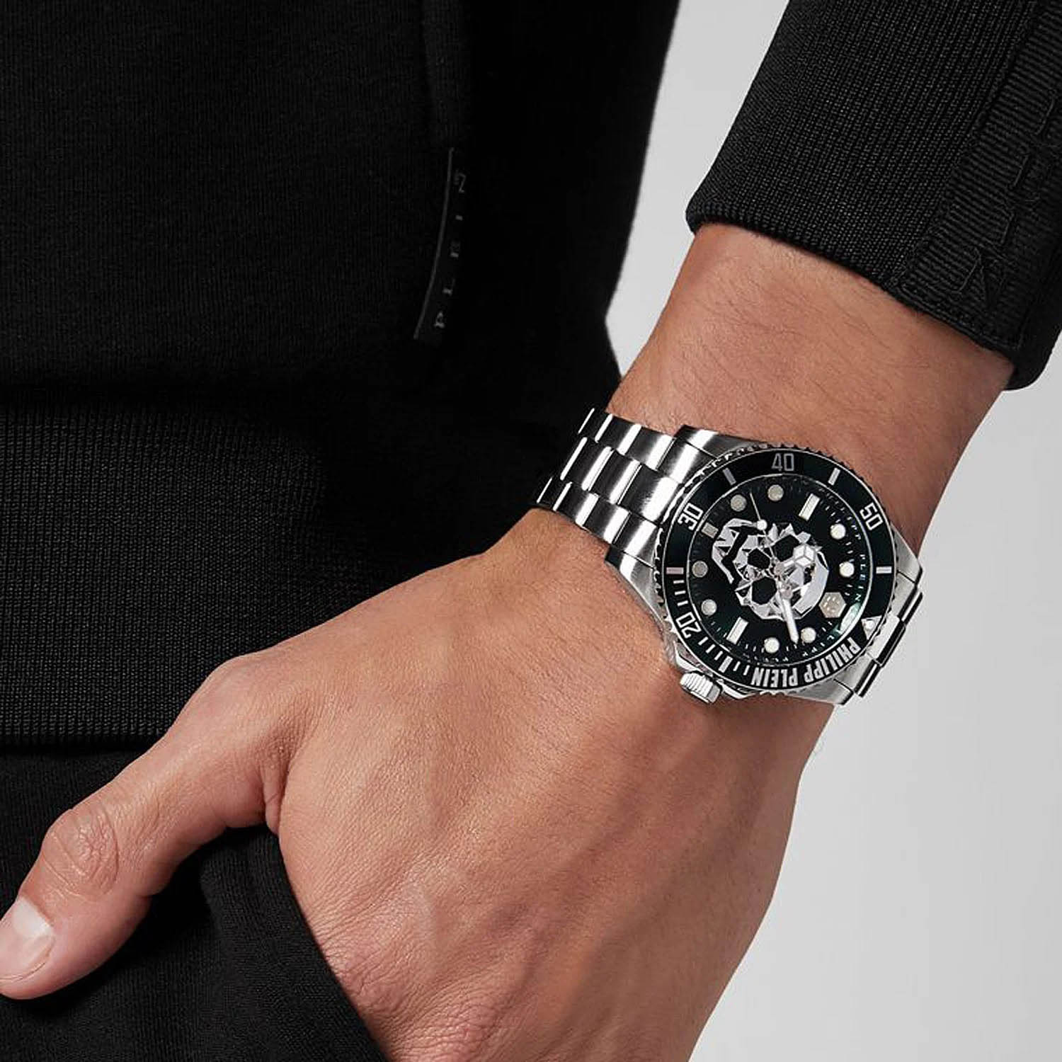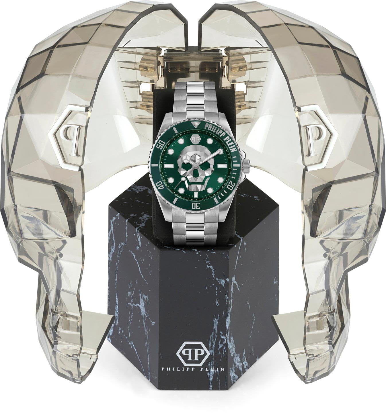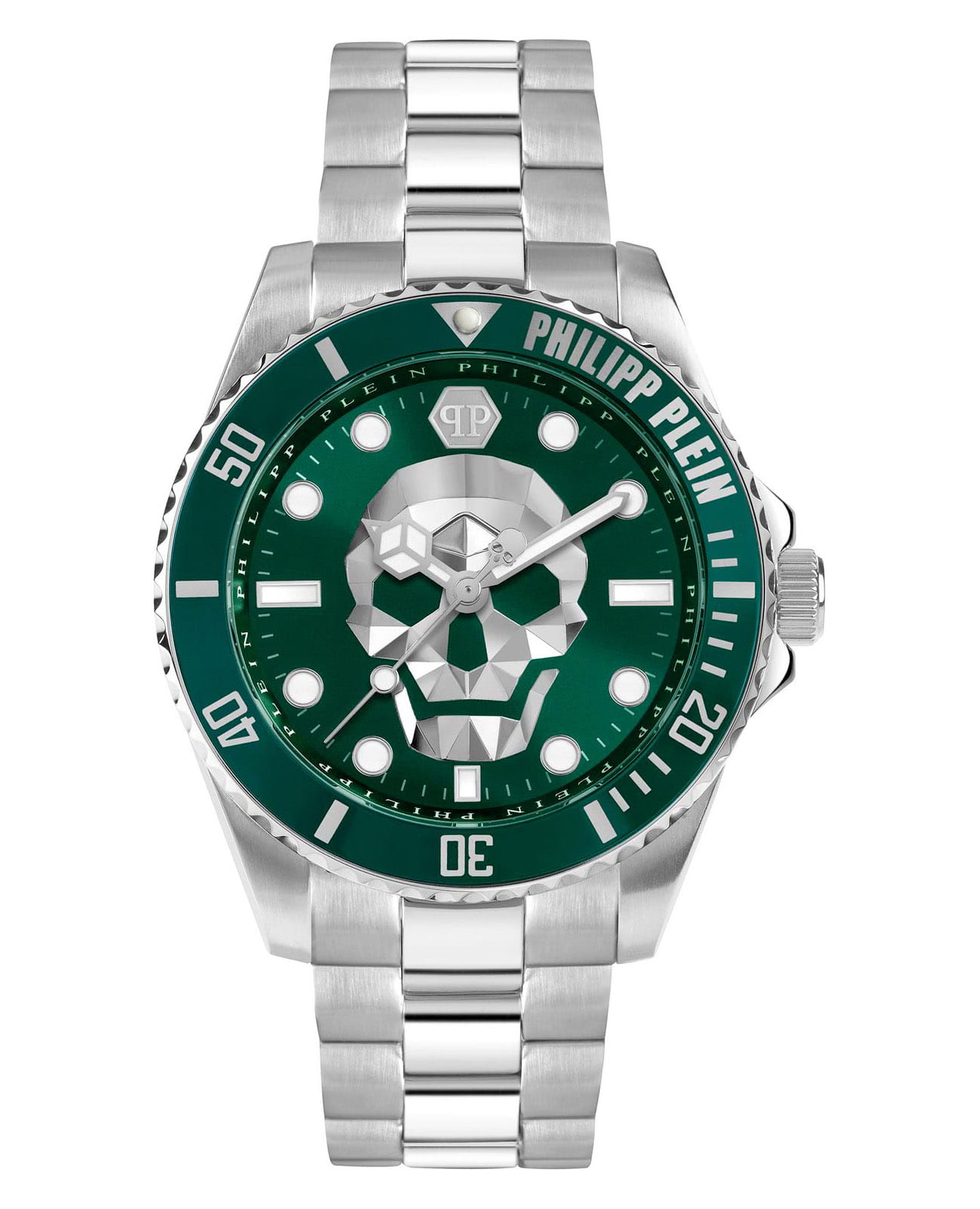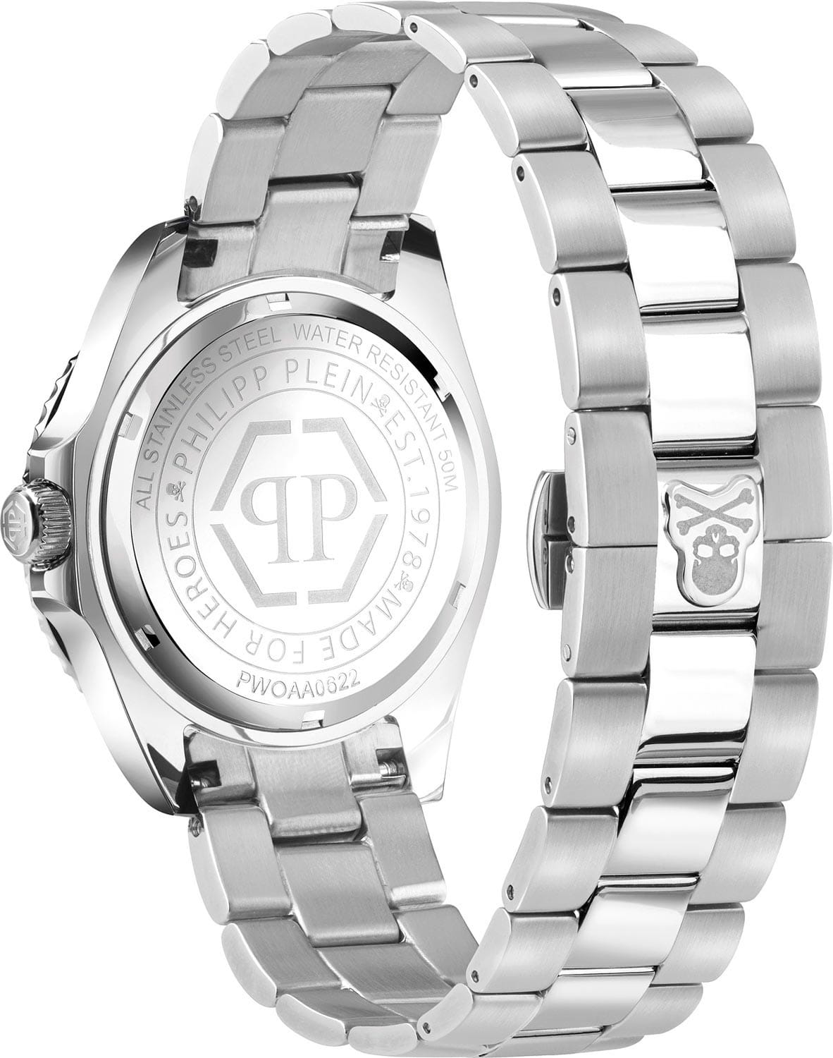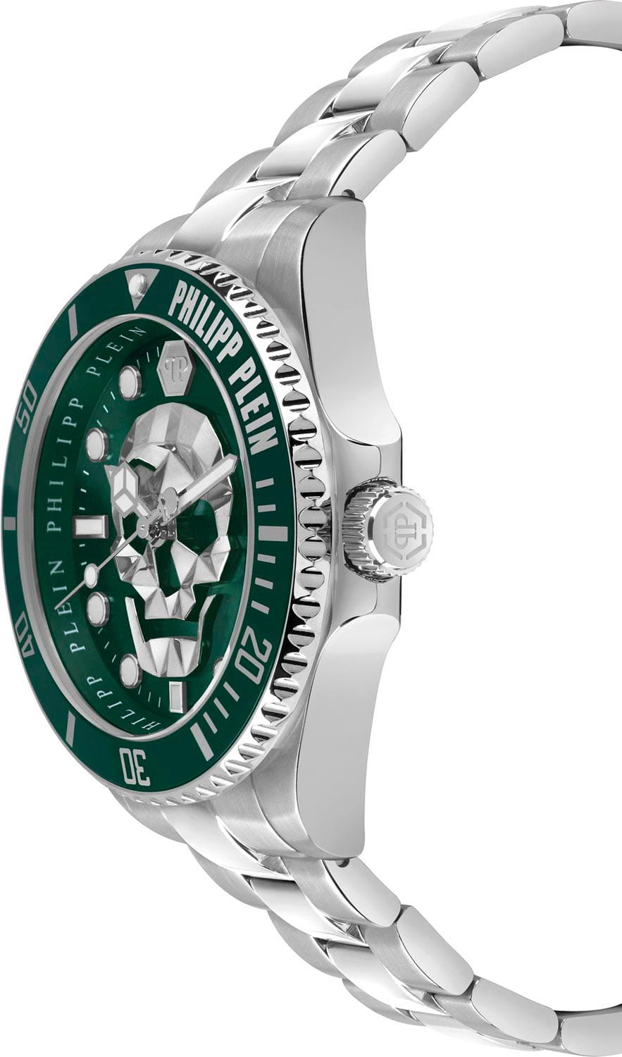 Яркие мужские часы с минеральным стекломМинеральное стеклоМинеральное стекло представляет собой искусственно выращенный минерал кварца. Такое стекло отличается особой устойчивостью к повреждениям и царапинам. Уступает по некоторым качествам сапфировому стеклу. Philipp Plein The Skull PWOAA0622, кварцевый механизм с высокой точностью. Класс водозащиты: 50 метров, позволит защитить корпус от случайных брызг или капель дождя. Корпус часов изготовлен из стали. Циферблат с метками в виде штрихов и точек украшен трехмерным граненым черепом и логотипом. Шестигранная заводная головка с защитой. Застёжка бабочка с кнопкамиЗастёжка "бабочка"Такой вид застёжки дополняется предохранителями, помогающими избежать случайного раскрытия браслета. Обладают изящным исполнением. .