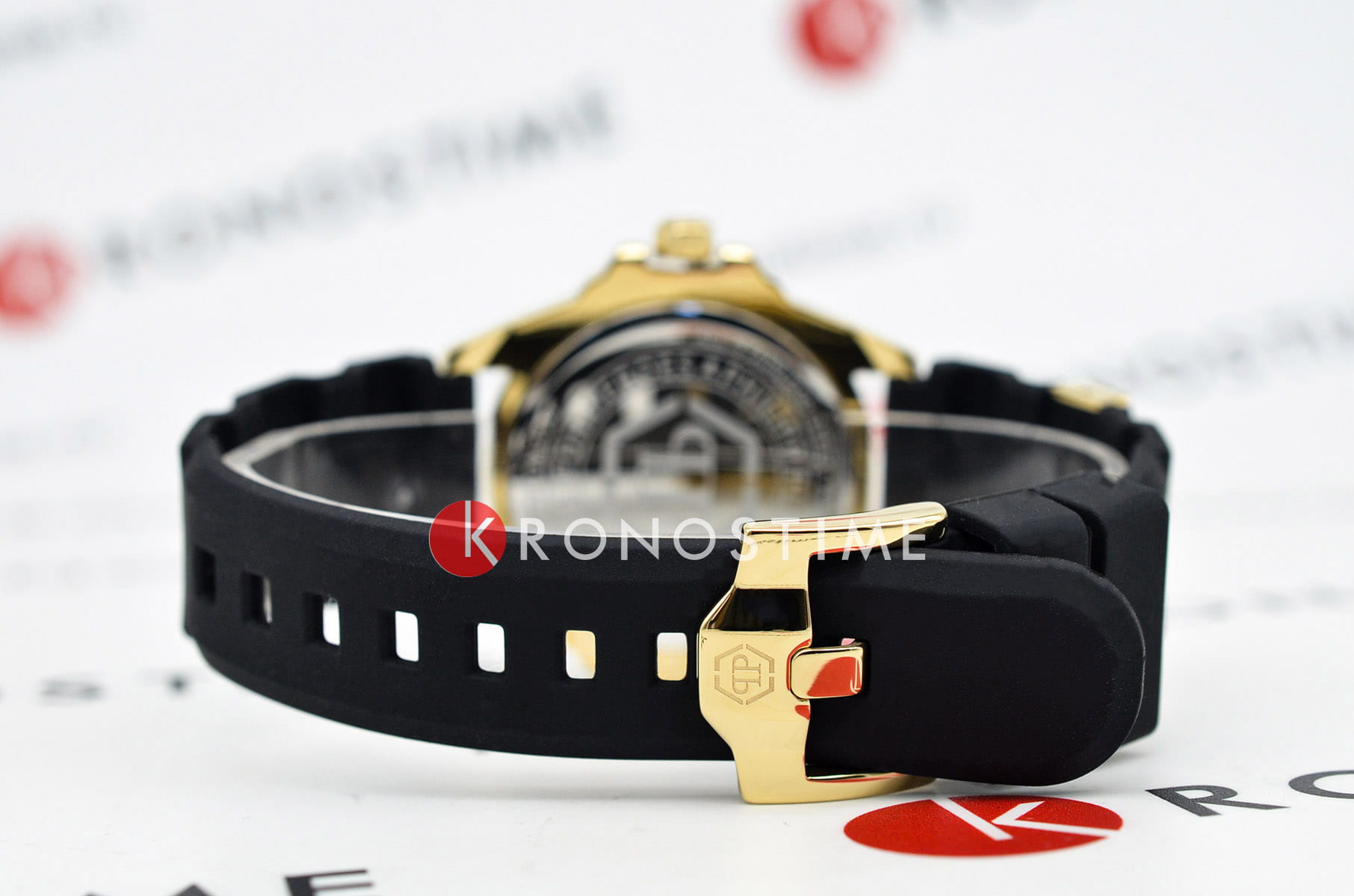 Philipp Plein Plein Majesty PWOFA0225 - дерзкое заявление любви к роскоши и бунтарскому стилю. Диаметр круглого корпуса из прочной нержавеющей стали с PVD-покрытиемPVDУльтратонкое покрытие наносится в технике вакуумного напыления, сочетает в себе нитрид титана особой прочности со слоем золота или оксида хрома. Несёт в себе декоративную или защитную функцию. равен 38 мм. Силиконовый ремешок на стандартной застёжке обеспечивает надёжную фиксацию и комфортное ношение. Метки в виде кристаллов Preciosa. Минеральное стеклоМинеральное стеклоМинеральное стекло представляет собой искусственно выращенный минерал кварца. Такое стекло отличается особой устойчивостью к повреждениям и царапинам. Уступает по некоторым качествам сапфировому стеклу. защищает циферблат от царапин. Люминесцентное покрытиеЛюминесцентное покрытиеПозволяет считывать показания времени в темноте. Производители наносят на стрелки, часовые индексы, безель или поверхность циферблата светонакопительный состав, дающий холодное свечение. стрелок и меток позволит следить за временем даже в полной темноте. БезельБезельВнешний ободок, закрепляющий стекло. В спортивных часах так называется поворотное кольцо с делениями на циферблате, выполняет роль таймера – замеряет отрезки времени на шкале. Неподвижный безель – элемент декора. Однонаправленно вращающийся безель на дайверских часах позволяет фиксировать моменты погружения и выныривания на поверхность. инкрустирован кристаллами. Влагозащита: 50 метров, позволит защитить корпус от случайных брызг или капель дождя. Идеальный аксессуар для тех, кто ценит индивидуальность и не боится выделяться из толпы.