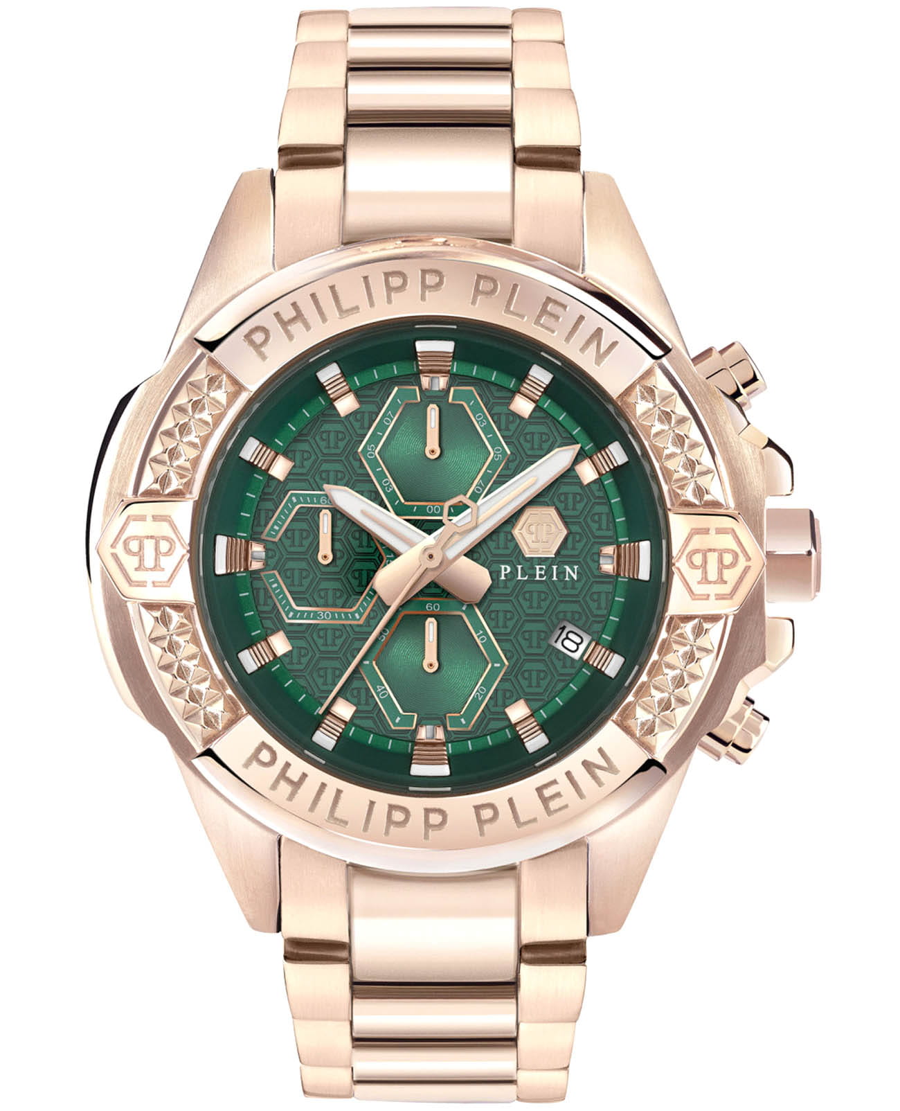 Philipp Plein The $kull Chrono PWWFA0625 - яркие часы-хронографХронографФункция позволяет измерять отрезки времени с особой точностью: часы, минуты, секунды. Верным признаком хронографа является наличие на циферблате 3 дополнительных окошек-счётчиков. в революционном дизайне несомненно добавят вам выразительности и станут главным акцентом вашего стильного образа. Мужские кварцевые часы с высокой точностью. Круглый стальной корпус с PVD-покрытиемPVDУльтратонкое покрытие наносится в технике вакуумного напыления, сочетает в себе нитрид титана особой прочности со слоем золота или оксида хрома. Несёт в себе декоративную или защитную функцию., диаметром 44 мм. Метки в виде штрихов. Минеральное стеклоМинеральное стеклоМинеральное стекло представляет собой искусственно выращенный минерал кварца. Такое стекло отличается особой устойчивостью к повреждениям и царапинам. Уступает по некоторым качествам сапфировому стеклу. защищает циферблат от царапин. Люминесцентное покрытиеЛюминесцентное покрытиеПозволяет считывать показания времени в темноте. Производители наносят на стрелки, часовые индексы, безель или поверхность циферблата светонакопительный состав, дающий холодное свечение. стрелок и меток позволит следить за временем даже в полной темноте. Окошко даты находится в положении 4 часа. Стальной браслет с PVD-покрытиемPVDУльтратонкое покрытие наносится в технике вакуумного напыления, сочетает в себе нитрид титана особой прочности со слоем золота или оксида хрома. Несёт в себе декоративную или защитную функцию. на застёжке-бабочке с кнопкамиЗастёжка "бабочка"Такой вид застёжки дополняется предохранителями, помогающими избежать случайного раскрытия браслета. Обладают изящным исполнением. , обеспечивает комфортное ношение. Граненая заводная головка. Влагозащита: 50 метров, позволит защитить корпус от случайных брызг или капель дождя. Идеальный аксессуар для тех, кто ценит индивидуальность и не боится выделяться из толпы.