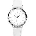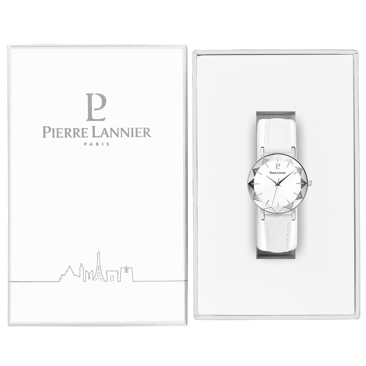 Женские кварцевые часы Pierre Lannier Multiples 009M600. Центральные часовая, минутная и секундная стрелки. Белый циферблат. Круглый корпус выполнен из полированной нержавеющей стали с фактурой по безелюБезельВнешний ободок, закрепляющий стекло. В спортивных часах так называется поворотное кольцо с делениями на циферблате, выполняет роль таймера – замеряет отрезки времени на шкале. Неподвижный безель – элемент декора. Однонаправленно вращающийся безель на дайверских часах позволяет фиксировать моменты погружения и выныривания на поверхность.. Белый кожаный ремешок шириной 14 мм, стандартная застежка. Прочное минеральное стеклоМинеральное стеклоМинеральное стекло представляет собой искусственно выращенный минерал кварца. Такое стекло отличается особой устойчивостью к повреждениям и царапинам. Уступает по некоторым качествам сапфировому стеклу., устойчивое к мелким механическим повреждениям. Водостойкость: 50 метров, позволит защитить корпус от случайных брызг или капель дождя.