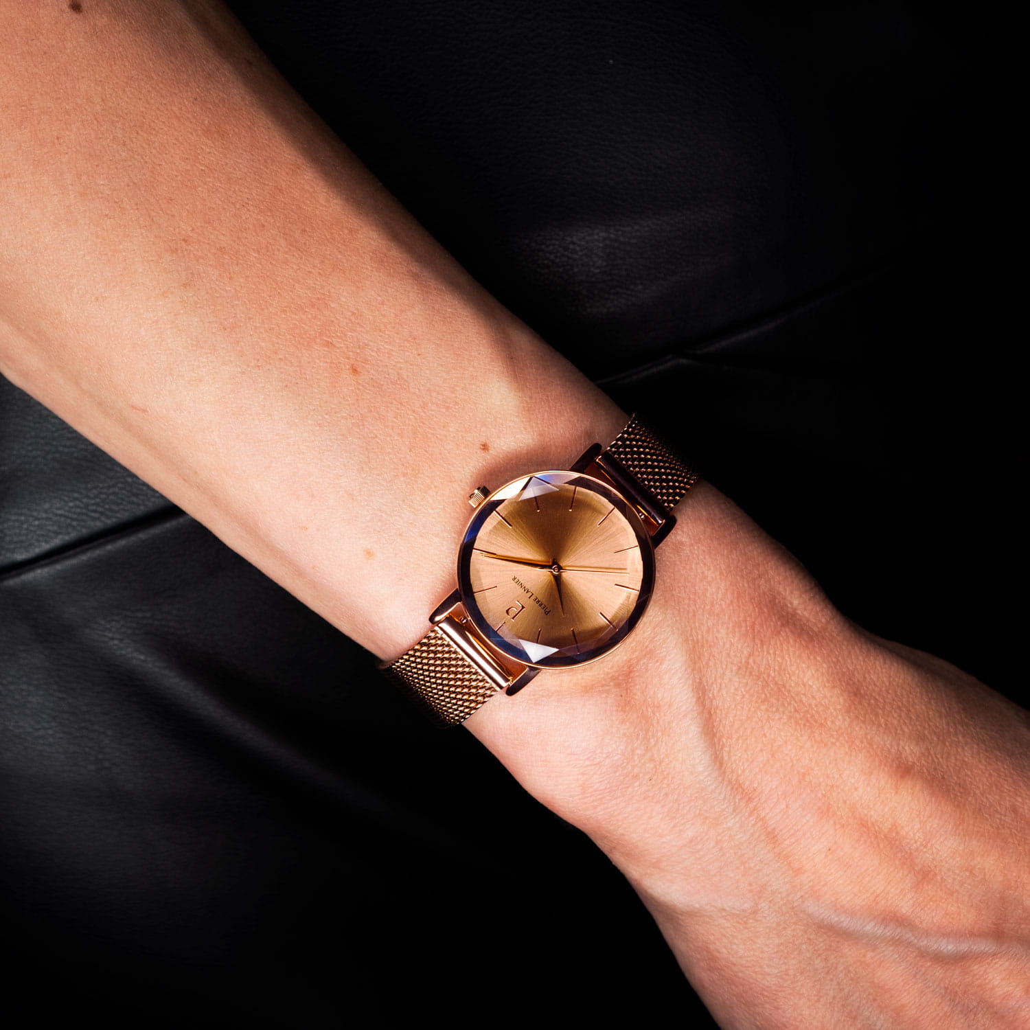 Женские кварцевые часы Pierre Lannier Multiples 010P958. Центральные часовая,минутная и секундная стрелки. Золотистый циферблат. Круглый корпус выполнен из полированной нержавеющей стали с фактурой по безелюБезельВнешний ободок, закрепляющий стекло. В спортивных часах так называется поворотное кольцо с делениями на циферблате, выполняет роль таймера – замеряет отрезки времени на шкале. Неподвижный безель – элемент декора. Однонаправленно вращающийся безель на дайверских часах позволяет фиксировать моменты погружения и выныривания на поверхность. с IP-покрытиемIP-покрытиеМетод ионного напыления. Демонстрирует повышенную устойчивость к истиранию, окислению и химическим веществам. Под воздействием высокого давления и температуры около 1500°C молекулы металла надёжно соединяются с частицами корпуса часов.. Стальной браслет выполнен в технике миланского плетения, раскладная застёжкаРаскладная застёжкаТакой тип застёжки используется только на браслетах из металла. Она никогда не раскрывается полностью, происходит разделение на 2 и более частей. Раскладывающая застёжка снизит вероятность потери часов к минимуму.. Прочное минеральное стеклоМинеральное стеклоМинеральное стекло представляет собой искусственно выращенный минерал кварца. Такое стекло отличается особой устойчивостью к повреждениям и царапинам. Уступает по некоторым качествам сапфировому стеклу., устойчивое к мелким механическим повреждениям. Водостойкость: 50 метров, позволит защитить корпус от случайных брызг или капель дождя.