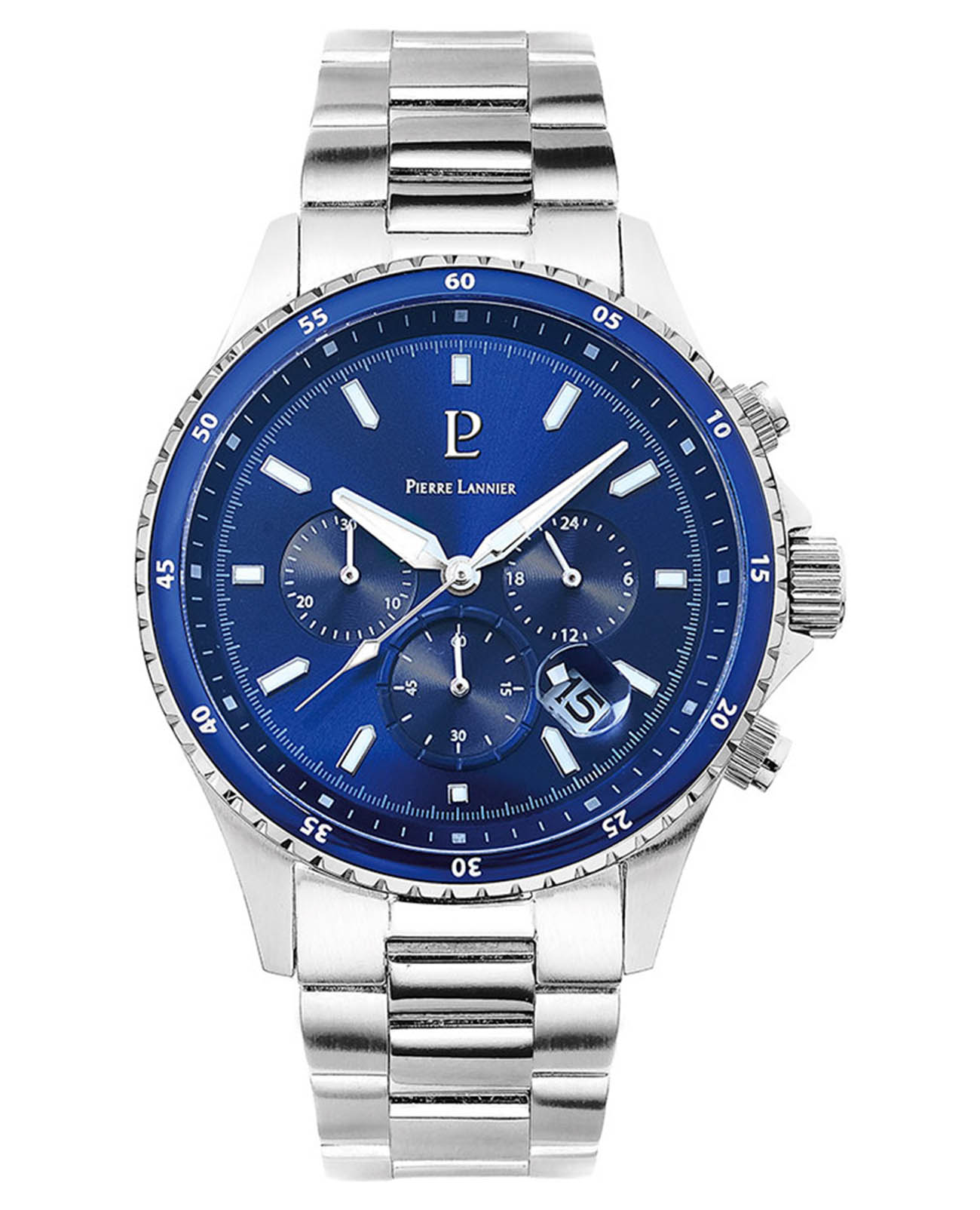 Мужские кварцевые часы Pierre Lannier Cronos 226G161. Часы хронографХронографФункция позволяет измерять отрезки времени с особой точностью: часы, минуты, секунды. Верным признаком хронографа является наличие на циферблате 3 дополнительных окошек-счётчиков. с секундомеромСекундомерСекундоме́р — прибор, способный измерять интервалы времени с точностью до долей секунды.. Минеральное стеклоМинеральное стеклоМинеральное стекло представляет собой искусственно выращенный минерал кварца. Такое стекло отличается особой устойчивостью к повреждениям и царапинам. Уступает по некоторым качествам сапфировому стеклу. устойчивое к мелким механическим повреждениям. Центральные часовая и минутная стрелки, секундная стрелка вынесена на малый циферблат. Окошко даты между 4 и 5 часам. Корпус и вращающийся безельБезельВнешний ободок, закрепляющий стекло. В спортивных часах так называется поворотное кольцо с делениями на циферблате, выполняет роль таймера – замеряет отрезки времени на шкале. Неподвижный безель – элемент декора. Однонаправленно вращающийся безель на дайверских часах позволяет фиксировать моменты погружения и выныривания на поверхность. из нержавеющей стали с IP-покрытиемIP-покрытиеМетод ионного напыления. Демонстрирует повышенную устойчивость к истиранию, окислению и химическим веществам. Под воздействием высокого давления и температуры около 1500°C молекулы металла надёжно соединяются с частицами корпуса часов.. Стрелки с люминесцентным покрытиемЛюминесцентное покрытиеПозволяет считывать показания времени в темноте. Производители наносят на стрелки, часовые индексы, безель или поверхность циферблата светонакопительный состав, дающий холодное свечение.. Водостойкость: 100 метров, позволит плавать, нырять и заниматься другими водными видами спорта. Стальной браслет с раскладной застёжкойРаскладная застёжкаТакой тип застёжки используется только на браслетах из металла. Она никогда не раскрывается полностью, происходит разделение на 2 и более частей. Раскладывающая застёжка снизит вероятность потери часов к минимуму..