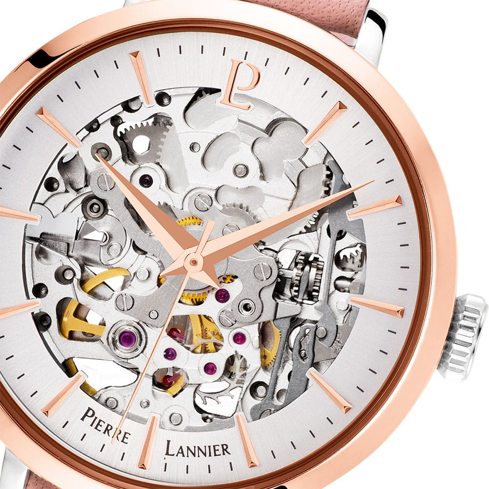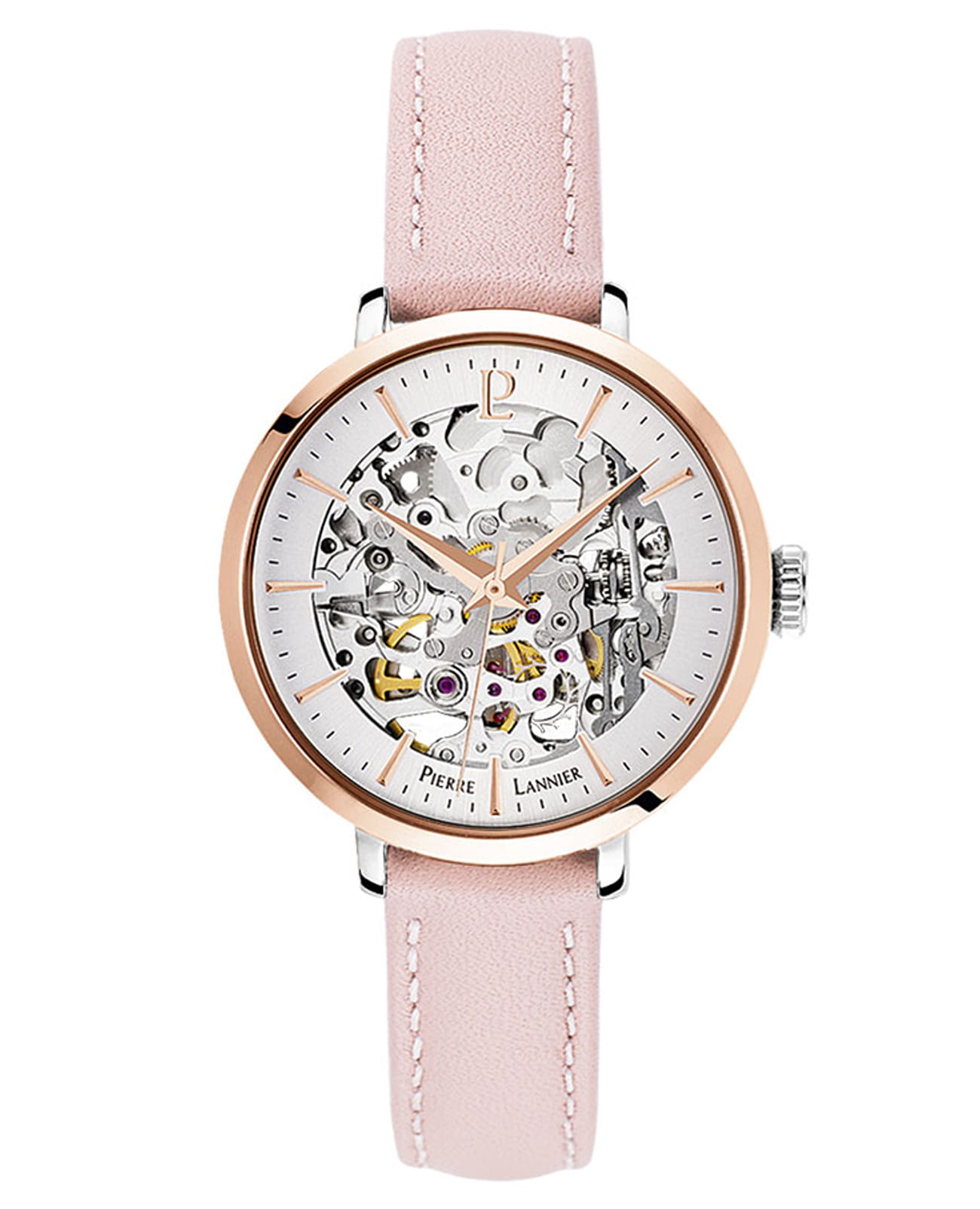 Женские механические часы с автоподзаводом Pierre Lannier Automatic 312B625. Минеральное стеклоМинеральное стеклоМинеральное стекло представляет собой искусственно выращенный минерал кварца. Такое стекло отличается особой устойчивостью к повреждениям и царапинам. Уступает по некоторым качествам сапфировому стеклу. устойчивое к мелким механическим повреждениям. Скелетонизированный серебристый циферблат. Центральные часовая, минутная и секундная стрелки. Корпус выполнен из полированной нержавеющей стали с IP-покрытиемIP-покрытиеМетод ионного напыления. Демонстрирует повышенную устойчивость к истиранию, окислению и химическим веществам. Под воздействием высокого давления и температуры около 1500°C молекулы металла надёжно соединяются с частицами корпуса часов. цвета розового золота. Неподвижный безельБезельВнешний ободок, закрепляющий стекло. В спортивных часах так называется поворотное кольцо с делениями на циферблате, выполняет роль таймера – замеряет отрезки времени на шкале. Неподвижный безель – элемент декора. Однонаправленно вращающийся безель на дайверских часах позволяет фиксировать моменты погружения и выныривания на поверхность. из нержавеющей стали с IP-покрытиемIP-покрытиеМетод ионного напыления. Демонстрирует повышенную устойчивость к истиранию, окислению и химическим веществам. Под воздействием высокого давления и температуры около 1500°C молекулы металла надёжно соединяются с частицами корпуса часов. цвета розового золота. Водостойкость: 30 метров, позволит защитить корпус от случайных брызг или капель дождя. Розовый кожаный ремешок, стандартная застежка.
