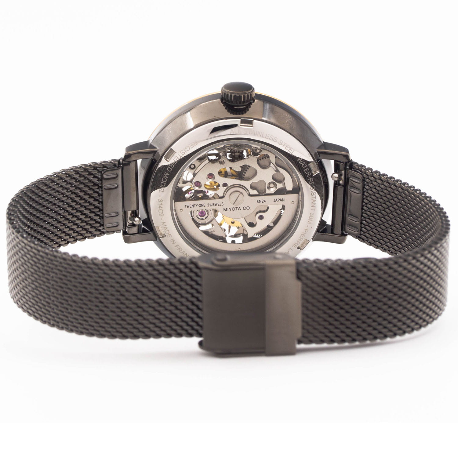 Женские механические часы с автоподзаводом Pierre Lannier Automatic 314C988 . Минеральное стеклоМинеральное стеклоМинеральное стекло представляет собой искусственно выращенный минерал кварца. Такое стекло отличается особой устойчивостью к повреждениям и царапинам. Уступает по некоторым качествам сапфировому стеклу. устойчивое к мелким механическим повреждениям. Скелетонизированный циферблат. Центральные часовая, минутная и секундная стрелки. Корпус и браслет выполнен из нержавеющей стали с IP-покрытиемIP-покрытиеМетод ионного напыления. Демонстрирует повышенную устойчивость к истиранию, окислению и химическим веществам. Под воздействием высокого давления и температуры около 1500°C молекулы металла надёжно соединяются с частицами корпуса часов.. Неподвижный безельБезельВнешний ободок, закрепляющий стекло. В спортивных часах так называется поворотное кольцо с делениями на циферблате, выполняет роль таймера – замеряет отрезки времени на шкале. Неподвижный безель – элемент декора. Однонаправленно вращающийся безель на дайверских часах позволяет фиксировать моменты погружения и выныривания на поверхность. из нержавеющей стали с IP-покрытиемIP-покрытиеМетод ионного напыления. Демонстрирует повышенную устойчивость к истиранию, окислению и химическим веществам. Под воздействием высокого давления и температуры около 1500°C молекулы металла надёжно соединяются с частицами корпуса часов. цвета розового золота. Водостойкость: 30 метров, позволит защитить корпус от случайных брызг или капель дождя. Стальной браслет миланского плетения с раскладной застёжкойРаскладная застёжкаТакой тип застёжки используется только на браслетах из металла. Она никогда не раскрывается полностью, происходит разделение на 2 и более частей. Раскладывающая застёжка снизит вероятность потери часов к минимуму..