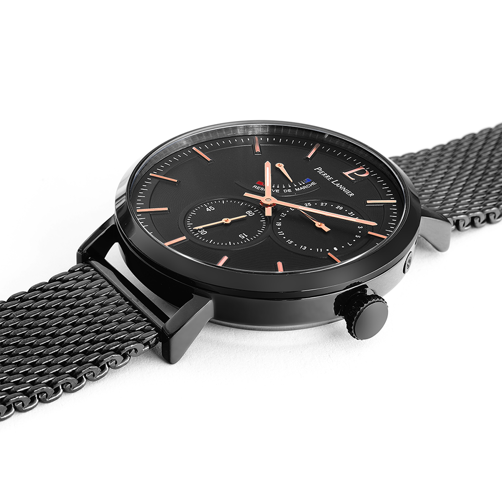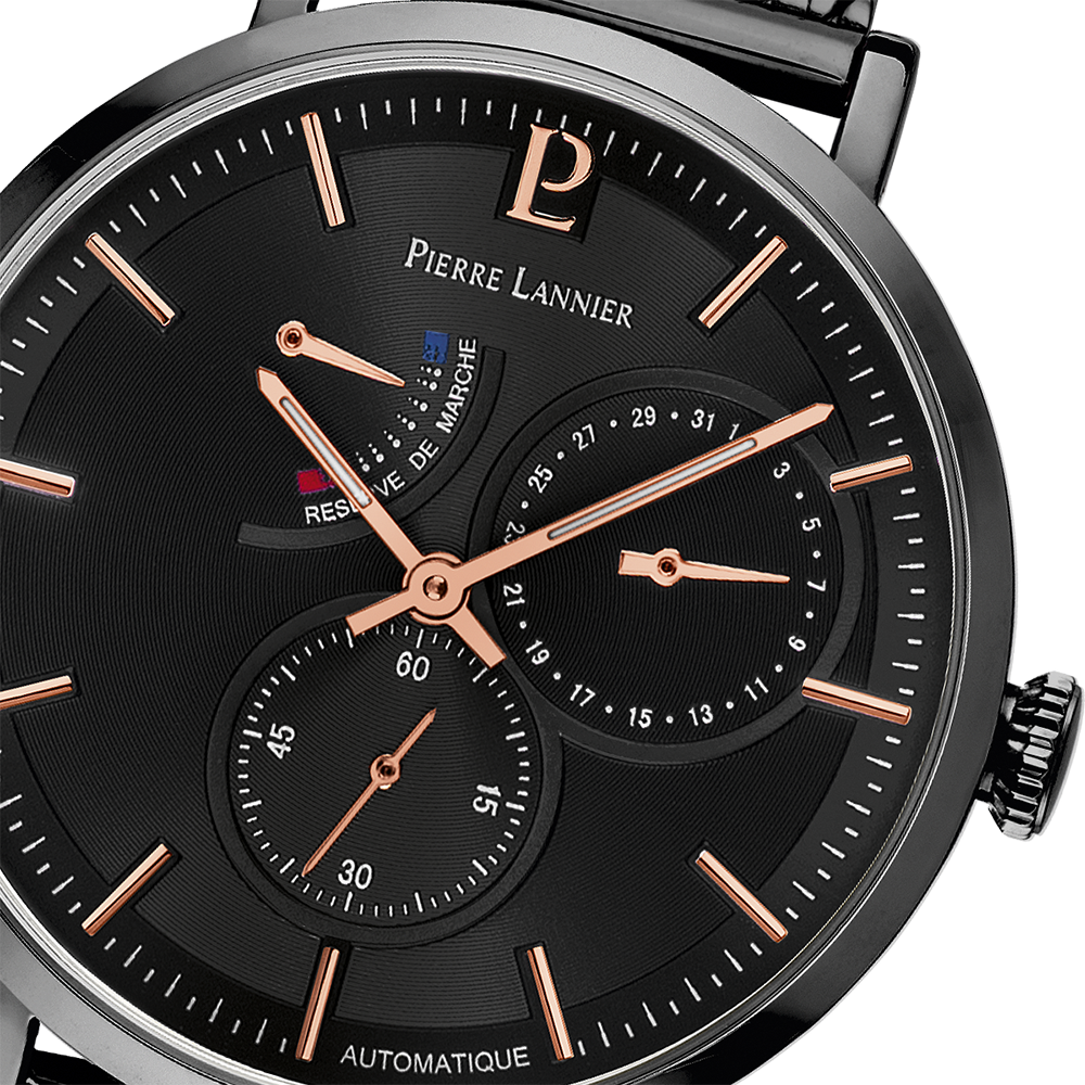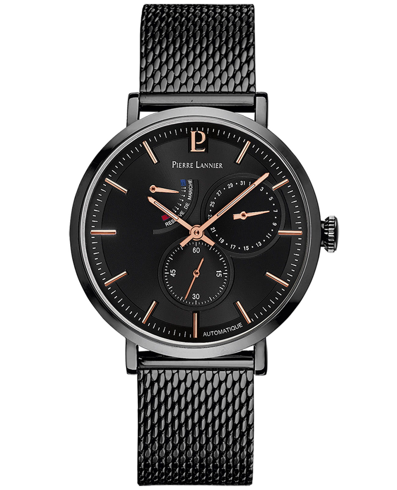 Мужские механические часы с автоподзаводом Pierre Lannier Evidence 328D438. Минеральное стеклоМинеральное стеклоМинеральное стекло представляет собой искусственно выращенный минерал кварца. Такое стекло отличается особой устойчивостью к повреждениям и царапинам. Уступает по некоторым качествам сапфировому стеклу. устойчивое к мелким механическим повреждениям. Центральные часовая и минутная стрелки, секундная стрелка вынесена на малый циферблат. Отображение даты в малом циферблате. Ретроградный индикатор запаса хода. Корпус и браслет выполнен из нержавеющей стали с IP-покрытиемIP-покрытиеМетод ионного напыления. Демонстрирует повышенную устойчивость к истиранию, окислению и химическим веществам. Под воздействием высокого давления и температуры около 1500°C молекулы металла надёжно соединяются с частицами корпуса часов.. Водостойкость: 50 метров, позволит защитить корпус от случайных брызг или капель дождя. Браслет миланского плетения с раскладной застёжкойРаскладная застёжкаТакой тип застёжки используется только на браслетах из металла. Она никогда не раскрывается полностью, происходит разделение на 2 и более частей. Раскладывающая застёжка снизит вероятность потери часов к минимуму.. Стрелки с люминесцентным покрытиемЛюминесцентное покрытиеПозволяет считывать показания времени в темноте. Производители наносят на стрелки, часовые индексы, безель или поверхность циферблата светонакопительный состав, дающий холодное свечение..